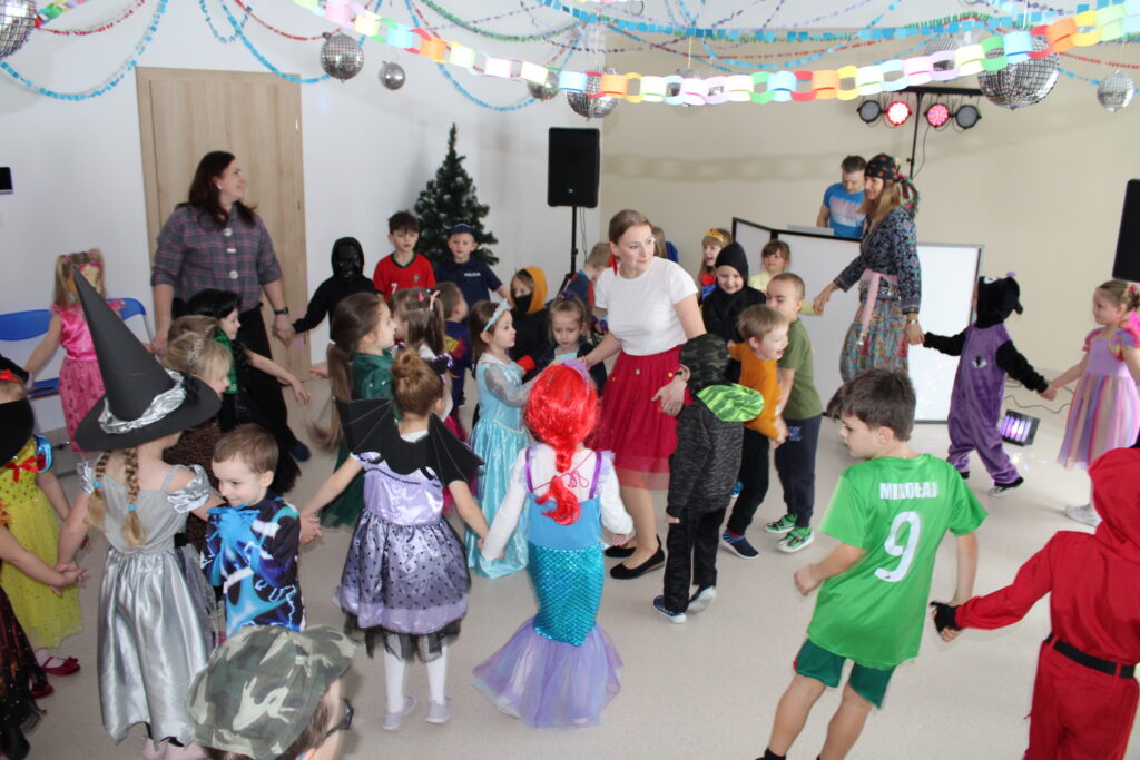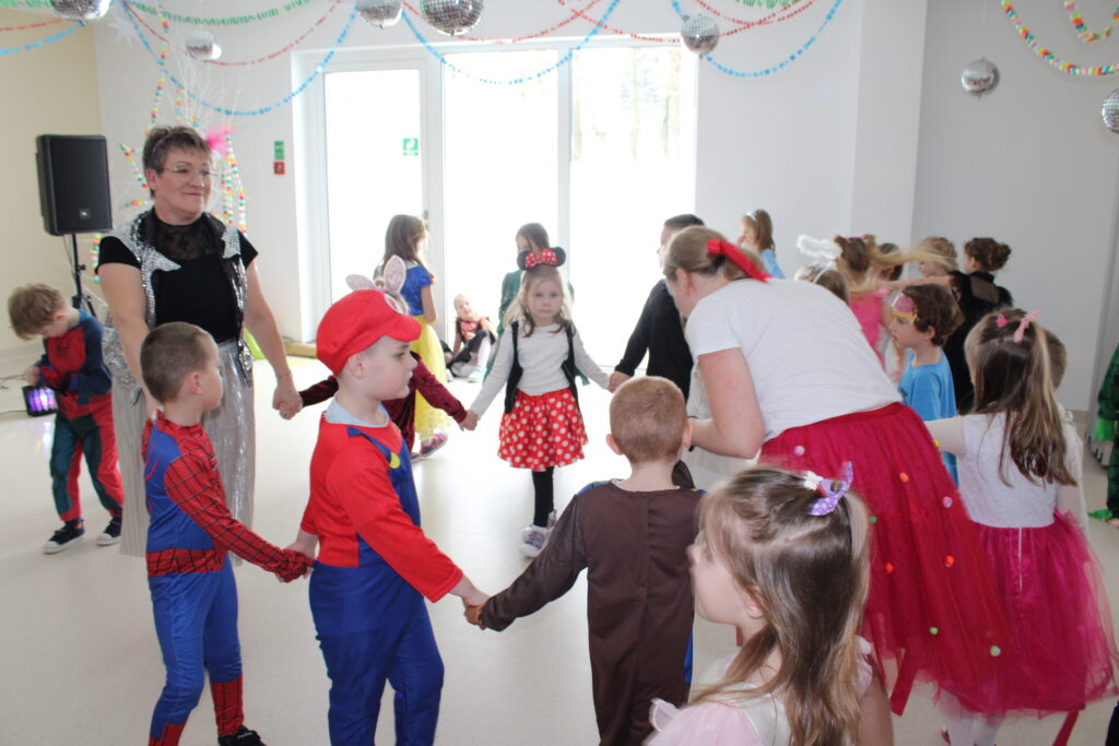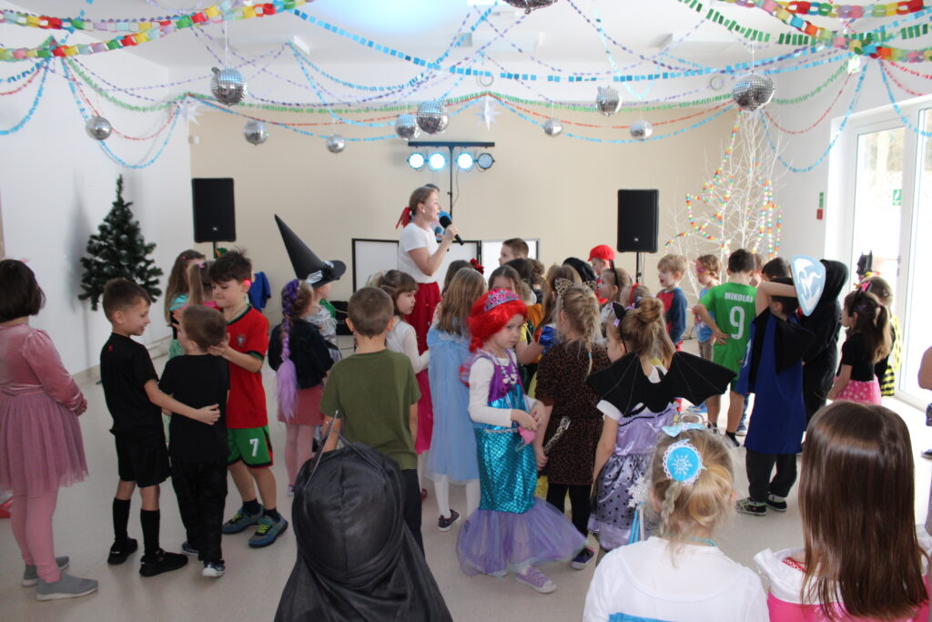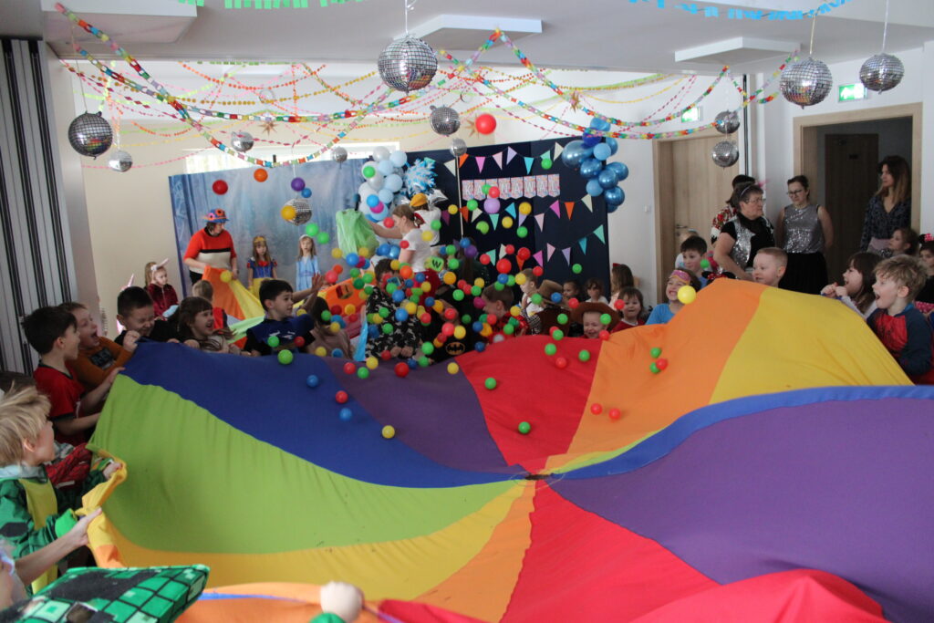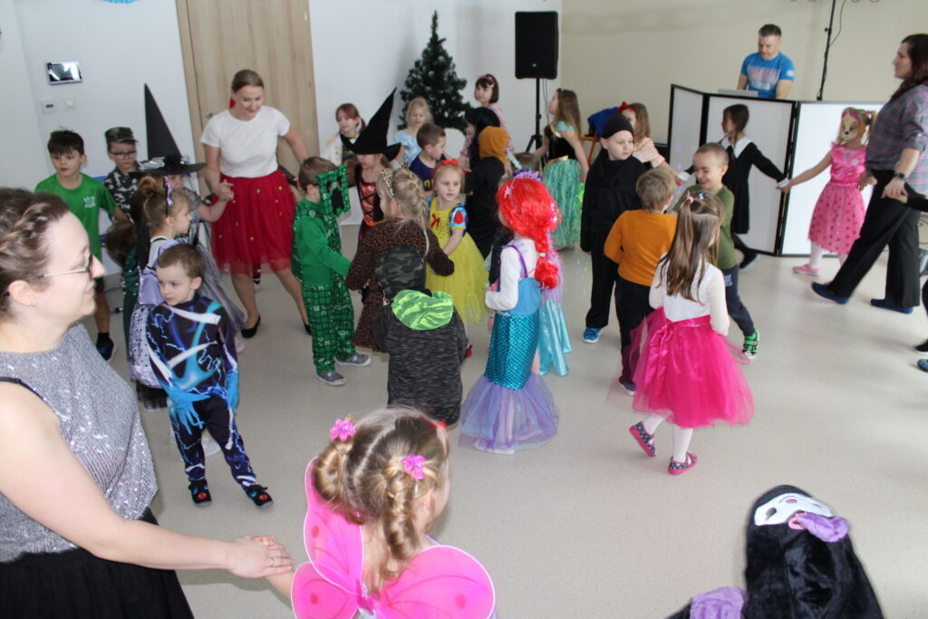 Zabawę poprowadziła pani animatorka Marta, która od pierwszych chwil porwała dzieci do wspólnych tańców i zabaw. Zarówno maluszki ze żłobka, jak i starsze przedszkolaki z ogromnym entuzjazmem uczestniczyły w przygotowanych atrakcjach.