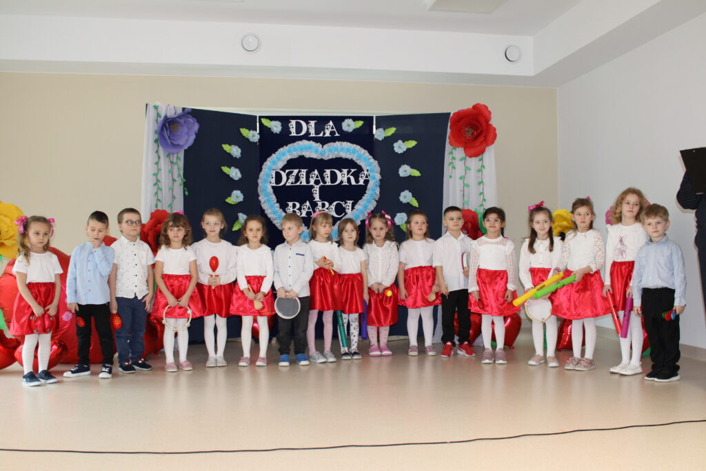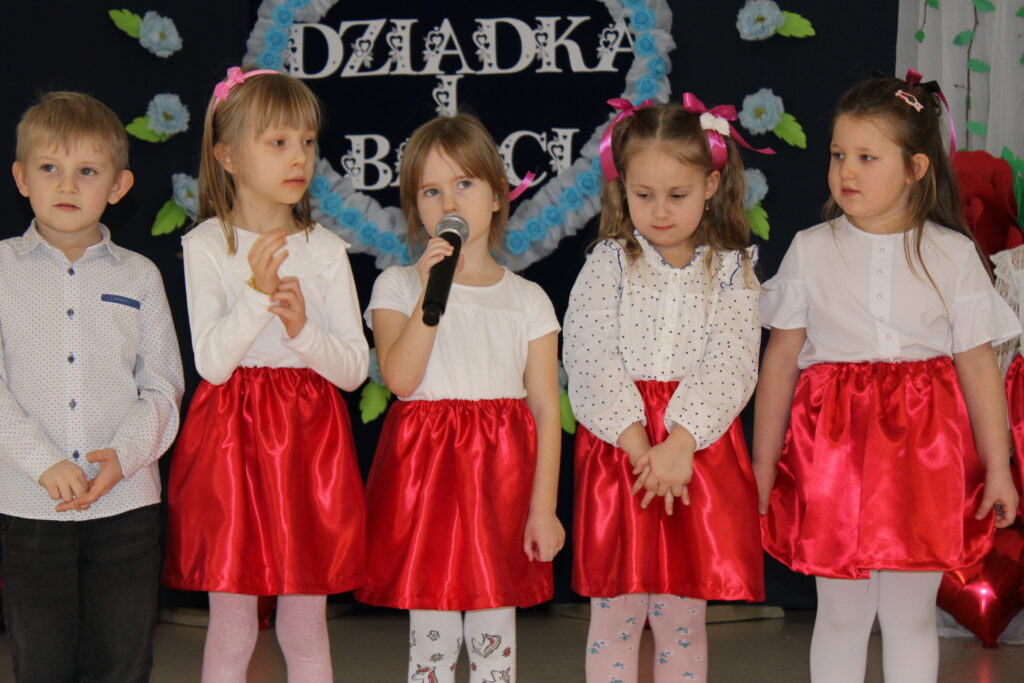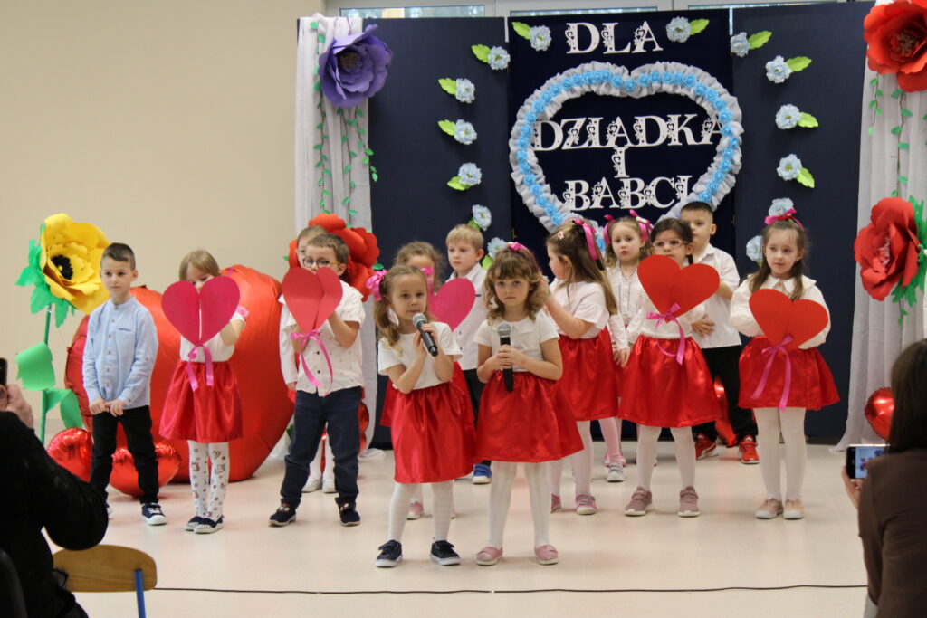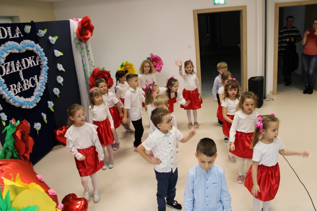 Przedszkolaki z wielkim zaangażowaniem zaprezentowały bogaty program artystyczny. Występ rozpoczął się od recytacji wierszyków, w których dzieci wyraziły swoją miłość i wdzięczność dla babć i dziadków. Następnie zabrzmiały radosne piosenki, a pełen energii taniec wprowadził wszystkich w doskonały nastrój.