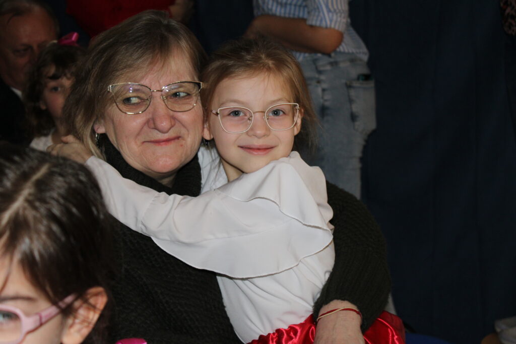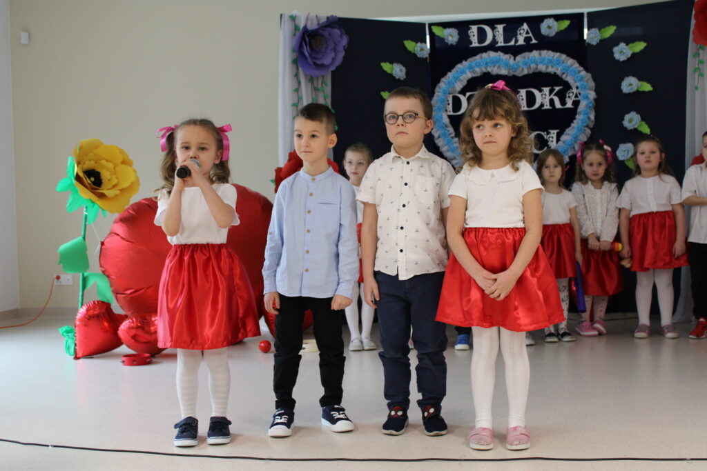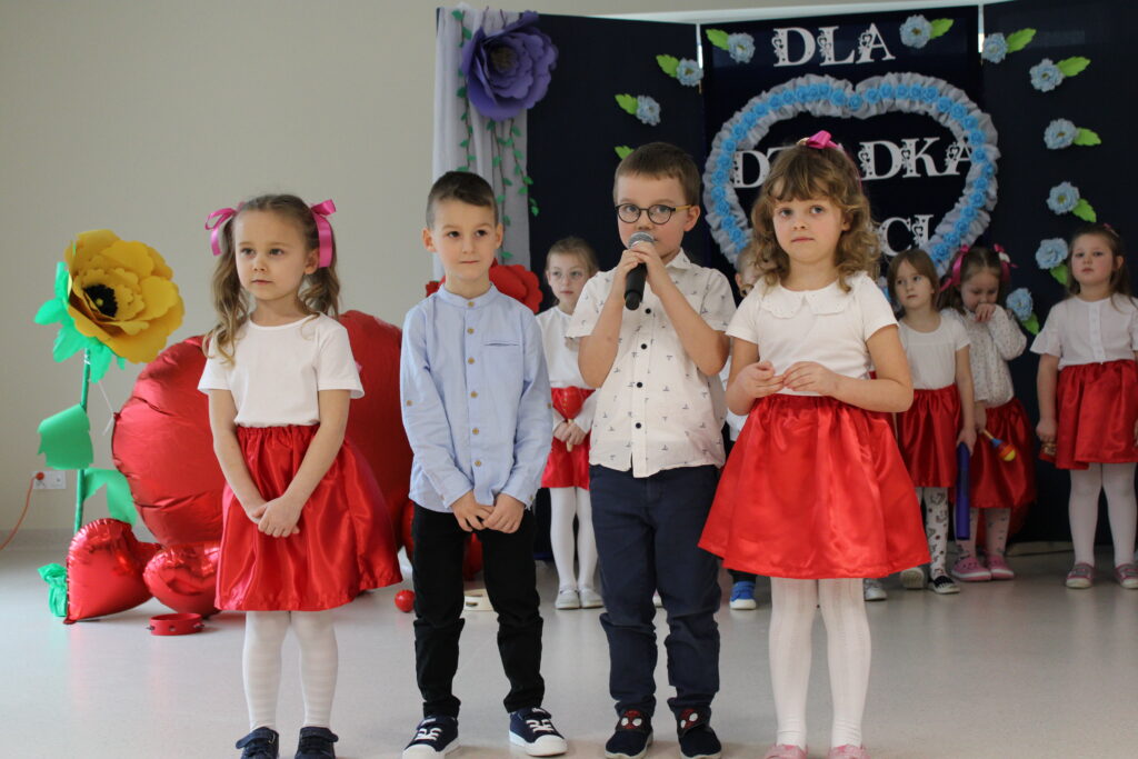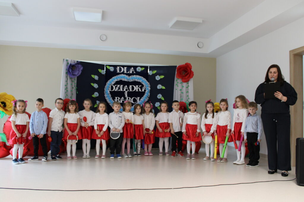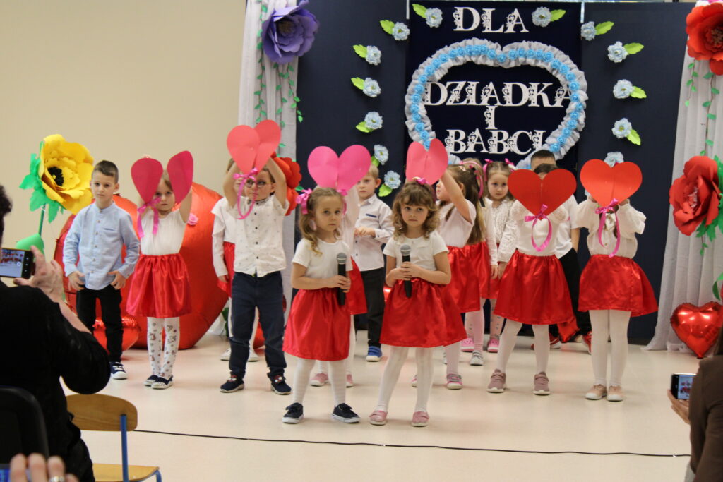 Przedszkolaki z wielkim zaangażowaniem zaprezentowały bogaty program artystyczny. Występ rozpoczął się od recytacji wierszyków, w których dzieci wyraziły swoją miłość i wdzięczność dla babć i dziadków. Następnie zabrzmiały radosne piosenki, a pełen energii taniec wprowadził wszystkich w doskonały nastrój.