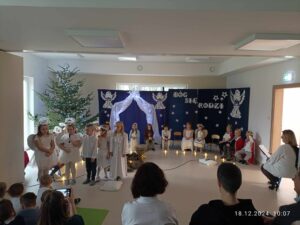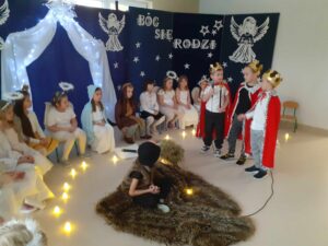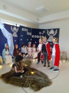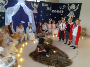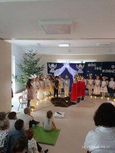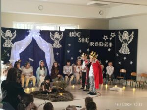 Dnia 18 grudnia 2024 roku w sali widowiskowej Przedszkola Gminnego w Siennicy Różanej o wyznaczonej godzinie zebrały się wszystkie dzieci z przedszkola, zaproszeni goście, pani dyrektor i personel przedszkola i żłobka, aby obejrzeć jasełka pt. „W Betlejem” przygotowane przez grupę „Rozśpiewane Zuchy” pod opieką pani Ewy Kaczor i Anny Żebrowskiej. Wierszem i piosenką opowiedziały historię narodzin Jezusa. Aktorzy znakomicie odegrali rolę Józefa i Maryi, Aniołów, Pasterzy oznajmiających wszystkim radosną nowinę o narodzeniu Jezusa, a także Trzech Króli, którzy przybyli złożyć pokłon i dary Panu. Przygotowane przez nasze panie dekoracje ozdobiły świąteczną przepiękną scenografię. Wspólny śpiew pięknych kolęd i pastorałek wprowadziły wszystkich zebranych w świąteczny nastrój. Dopełnieniem jasełek były piękne życzenia Bożonarodzeniowe złożone przez panią dyrektor Małgorzatę Padzińską dla wszystkich zebranych. Następnie dzieci wręczyły własnoręcznie wykonane prezenty. W imieniu wszystkich dzieci składamy podziękowania na ręce pani dyrektor Centrum Kultury w Siennicy Różaneji pani dyrektor Banku Spółdzielczego w Siennicy Różanej za słodki poczęstunek przygotowany dla dzieci.