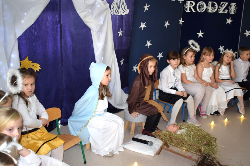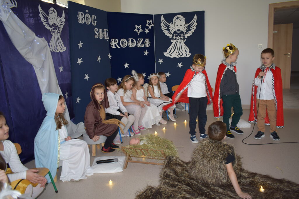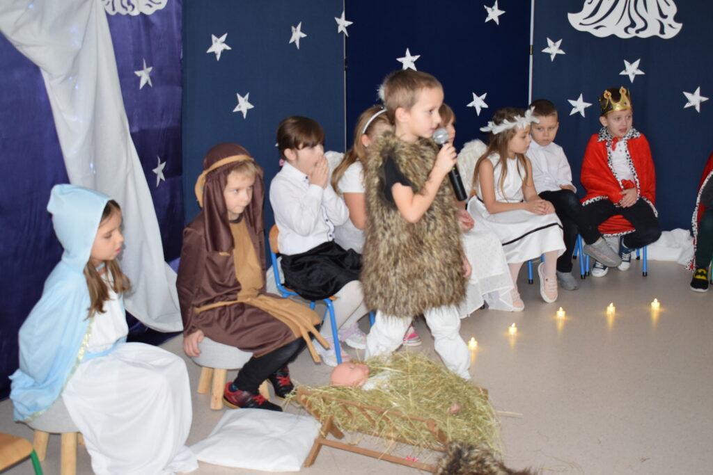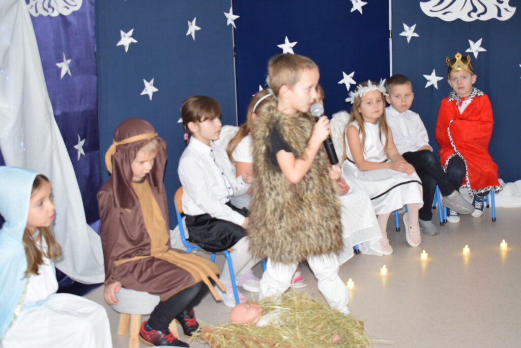 Dzieci w pięknych kostiumach wcieliły się w postacie biblijne, odgrywając sceny związane z narodzinami Jezusa. Mali artyści z pasją recytowali wiersze i śpiewali kolędy, zachwycając swoich starszych kolegów i koleżanki. Atmosfera była pełna radości, a występ wywołał wiele wzruszeń i oklasków.