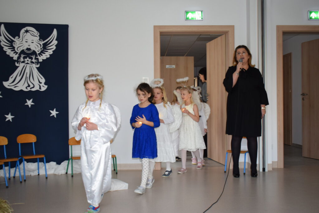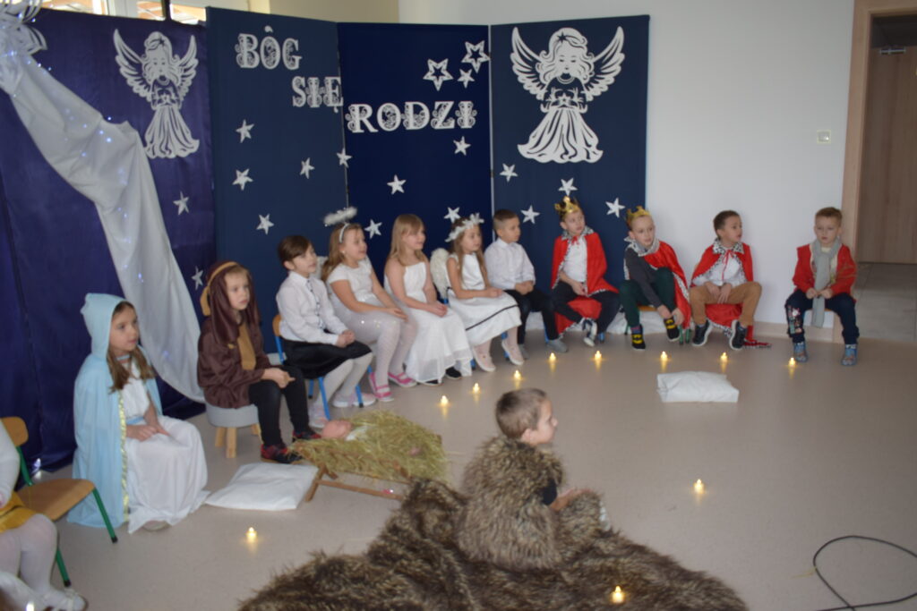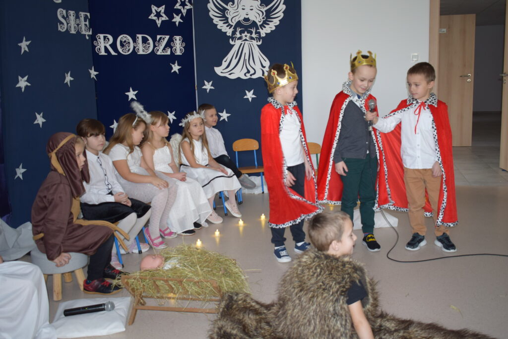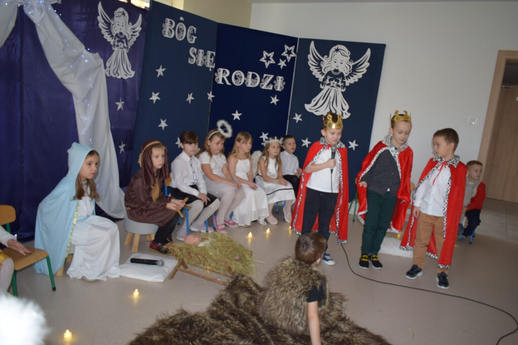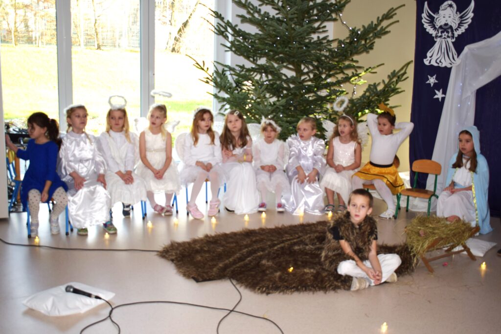 Dzieci w pięknych kostiumach wcieliły się w postacie biblijne, odgrywając sceny związane z narodzinami Jezusa. Mali artyści z pasją recytowali wiersze i śpiewali kolędy, zachwycając swoich starszych kolegów i koleżanki. Atmosfera była pełna radości, a występ wywołał wiele wzruszeń i oklasków.
