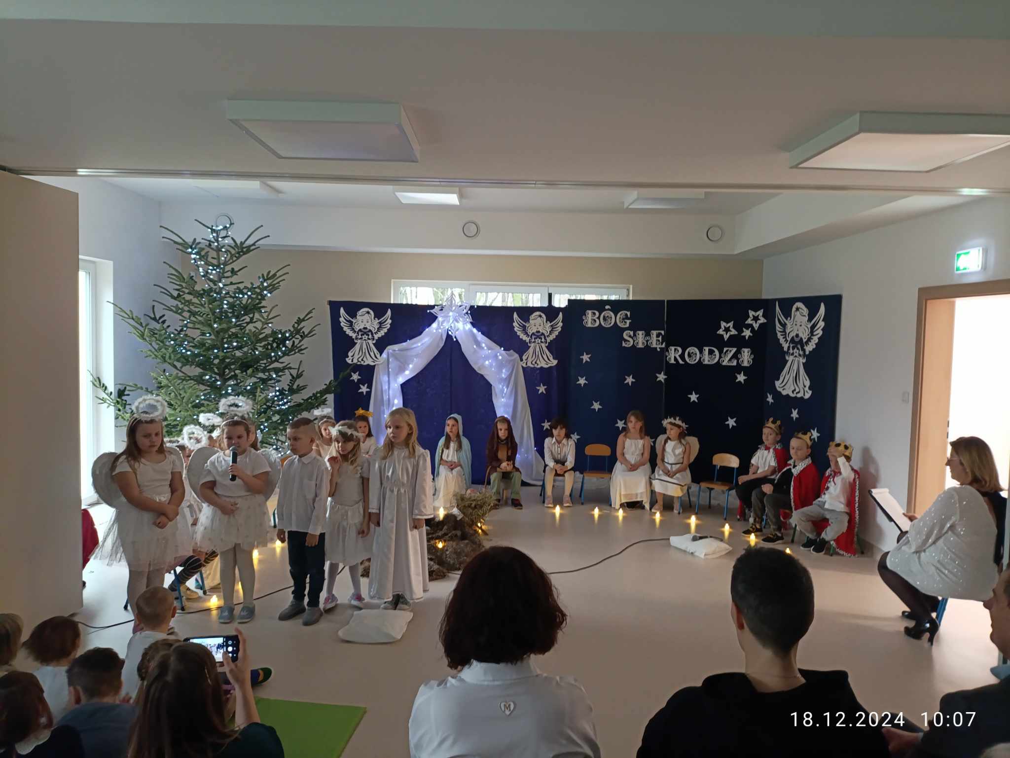 Dnia 18 grudnia 2024 roku w sali widowiskowej Przedszkola Gminnego w Siennicy Różanej o wyznaczonej godzinie zebrały się wszystkie dzieci z przedszkola, zaproszeni goście, pani dyrektor i personel przedszkola i żłobka, aby obejrzeć jasełka pt. „W Betlejem” przygotowane przez grupę „Rozśpiewane Zuchy” pod opieką pani Ewy Kaczor i Anny Żebrowskiej. Wierszem i piosenką opowiedziały historię narodzin Jezusa. Aktorzy znakomicie odegrali rolę Józefa i Maryi, Aniołów, Pasterzy oznajmiających wszystkim radosną nowinę o narodzeniu Jezusa, a także Trzech Króli, którzy przybyli złożyć pokłon i dary Panu. Przygotowane przez nasze panie dekoracje ozdobiły świąteczną przepiękną scenografię. Wspólny śpiew pięknych kolęd i pastorałek wprowadziły wszystkich zebranych w świąteczny nastrój. Dopełnieniem jasełek były piękne życzenia Bożonarodzeniowe złożone przez panią dyrektor Małgorzatę Padzińską dla wszystkich zebranych. Następnie dzieci wręczyły własnoręcznie wykonane prezenty. W imieniu wszystkich dzieci składamy podziękowania na ręce pani dyrektor Centrum Kultury w Siennicy Różaneji pani dyrektor Banku Spółdzielczego w Siennicy Różanej za słodki poczęstunek przygotowany dla dzieci.