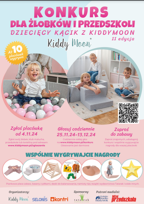 Nasza placówka bierze udział w konkursie „Dziecięcy Kącik z KiddyMoon” II edycja. Celem konkursu jest stworzenie kreatywnych i bezpiecznych miejsc zabaw dla najmłodszych w placówkach wychowania przedszkolnego oraz żłobkach, klubach malucha, świetlicach i punktach dziennej opieki z całej Polski. Spośród zgłoszonych do Konkursu Placówek, które wyraziły zgodę wzięcia w nim udziału, zostanie wyłonionych dziesięć, które zdobędą największą liczbę głosów Konkurs przeprowadzany będzie w Internecie za pośrednictwem strony internetowej Kiddymoon.pl pod adresem: https://kiddymoon.pl/pl/info/konkurs-120.html. Dziesięć Placówek, które w drodze głosowania uzyskają największą liczbę głosów otrzymają zestawy nagród oraz nagrody dodatkowe w postaci zestawów książek.