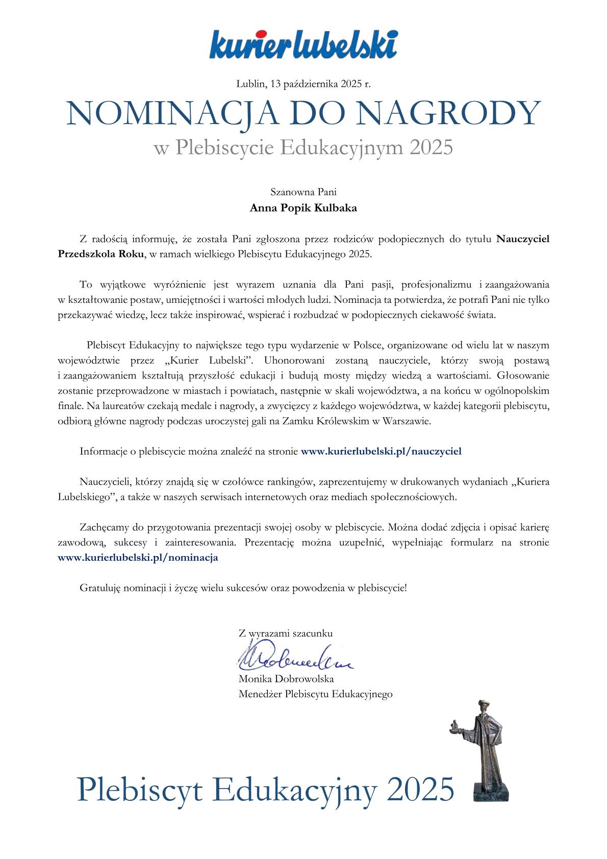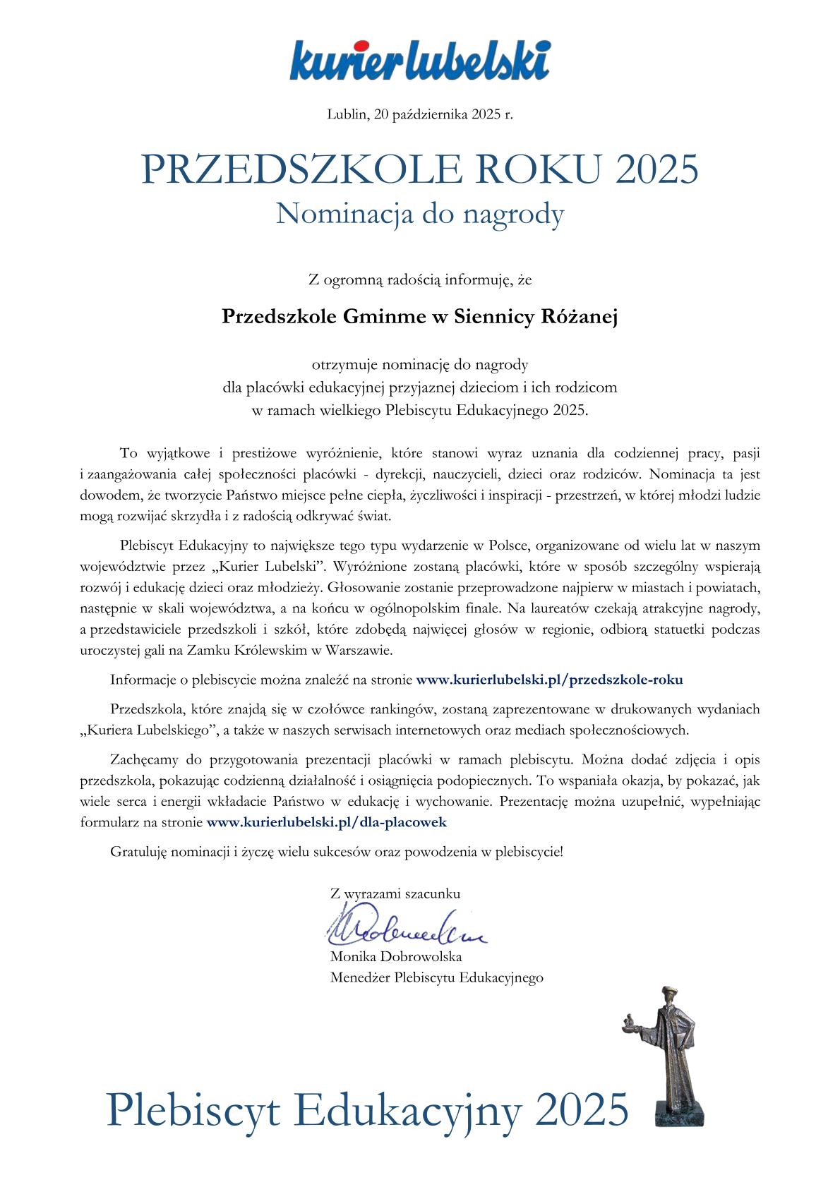 Nasza placówka została zgłoszona w plebiscycie ” Kuriera Lubelskiego” do nagrody w kategorii Przedszkole Roku w tegorocznej edycji Plebiscytu Edukacyjnego 2025. Ponadto nominację do nagrody dla najlepszego nauczyciela otrzymała Pani Anna Popik- Kulbaka. Głosowanie w plebiscycie rozpocznie się już we wtorek, 21 października. Wszystkie informacje o akcji można znaleźć w serwisie internetowym Kuriera Lubelskiego