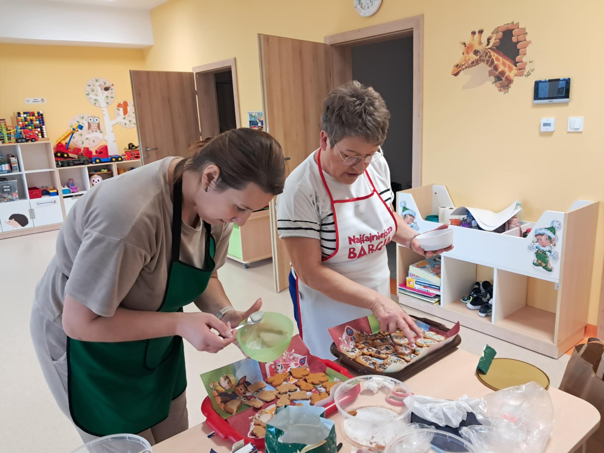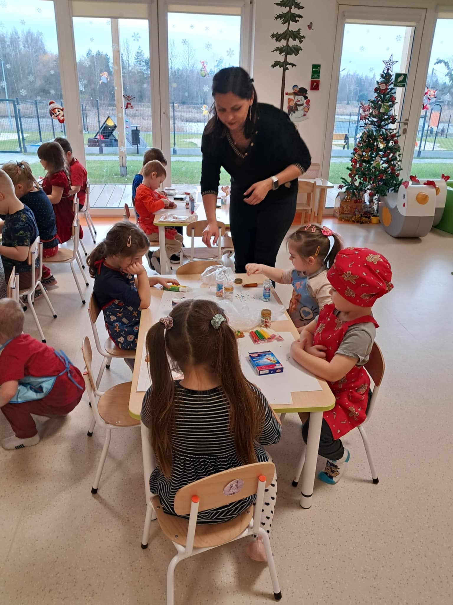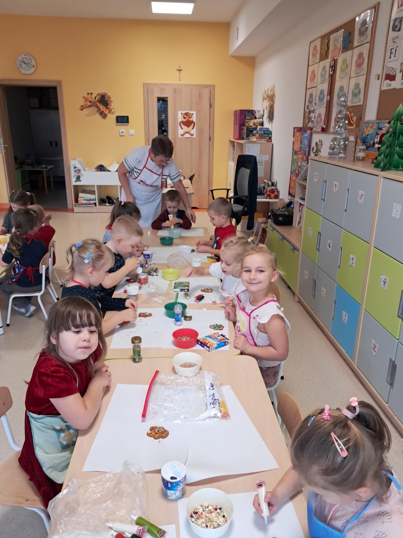 Dnia 15 grudnia 2025 roku dzieci z grupy „Sówki” rozpoczęły przygotowania do Świąt Bożego Narodzenia. Zdobienie pierniczków w przedszkolu to świetna świąteczna zabawa, która angażuje dzieci w dekorowanie pierniczków kolorowym lukrem, pisakami cukrowymi, posypkami, czekoladą, a nawet perełkami, rozwijając przy tym fantazję, motorykę małą i wprowadzając w świąteczny nastrój. Wszystko odbywało się przy miłym aromacie przypraw korzennych i radości z tworzenia małych dzieł sztuki. Dzieci świetnie się bawiły jednocześnie ucząc się tradycji bożonarodzeniowych.