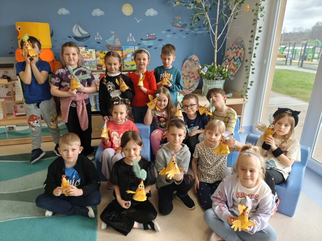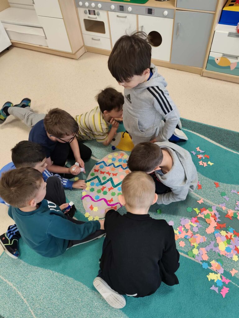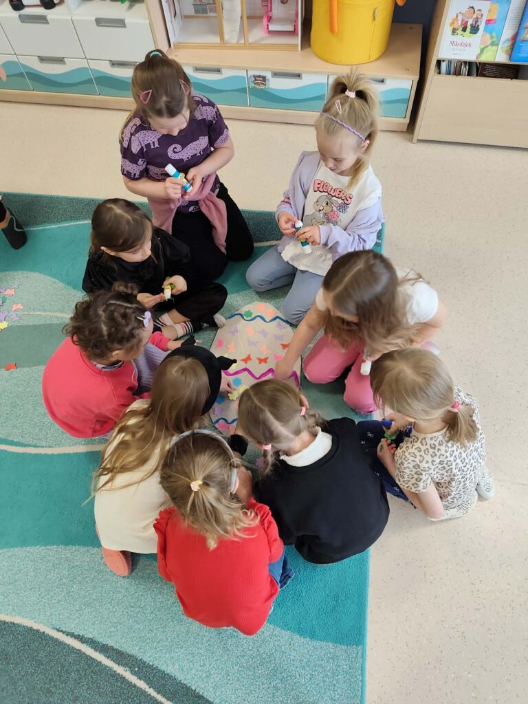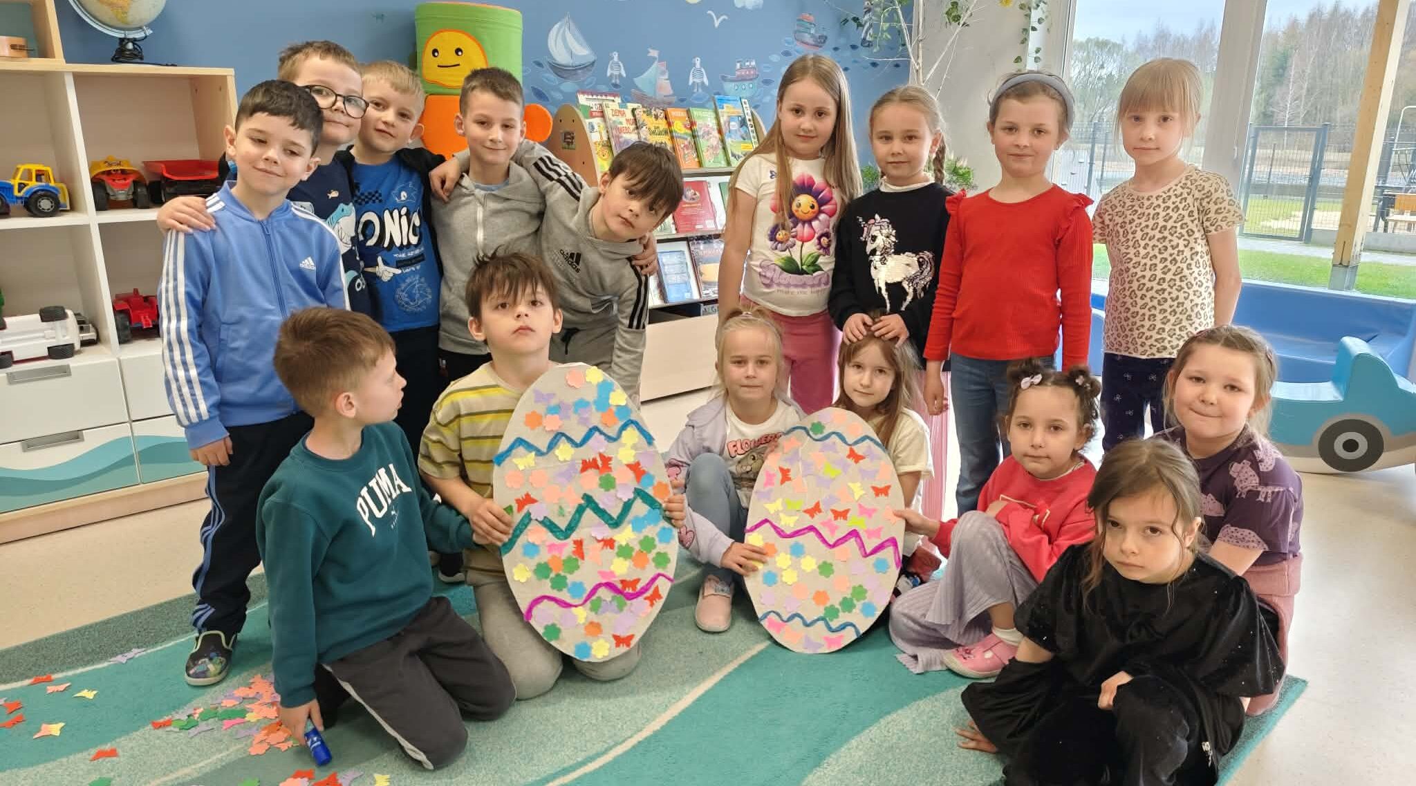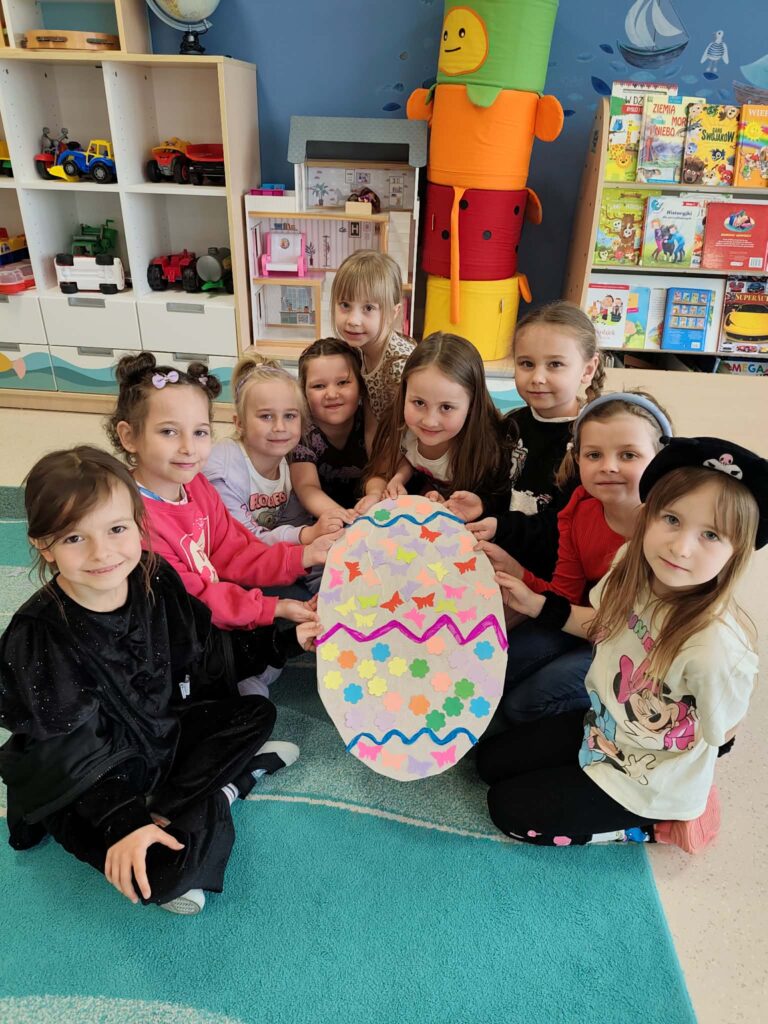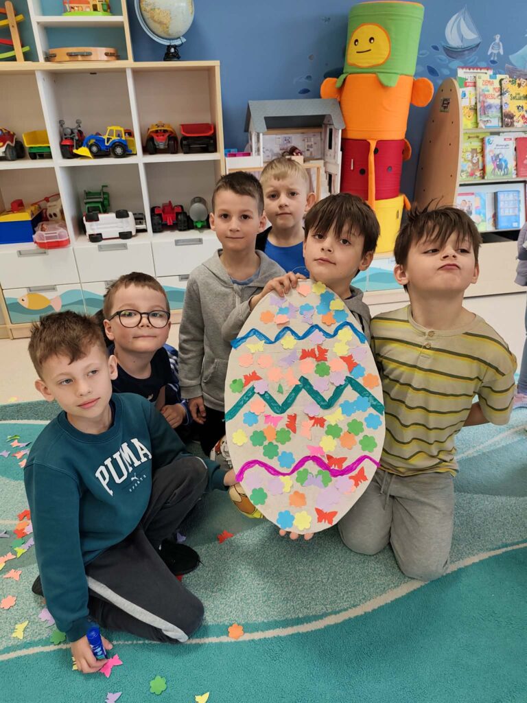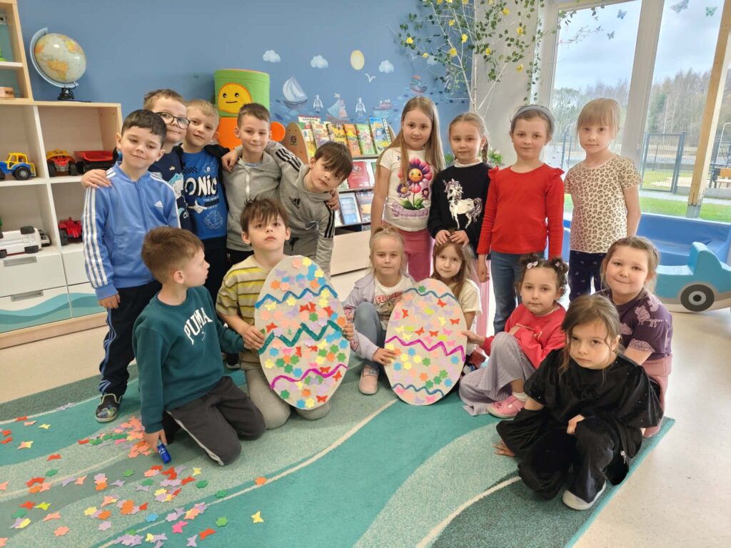W dalszej części warsztatów dzieci, pracując w grupach, wykonały duże papierowe pisanki, ucząc się współpracy i dzielenia zadaniami. Powstałe prace były kolorowe i pełne wiosennego charakteru.