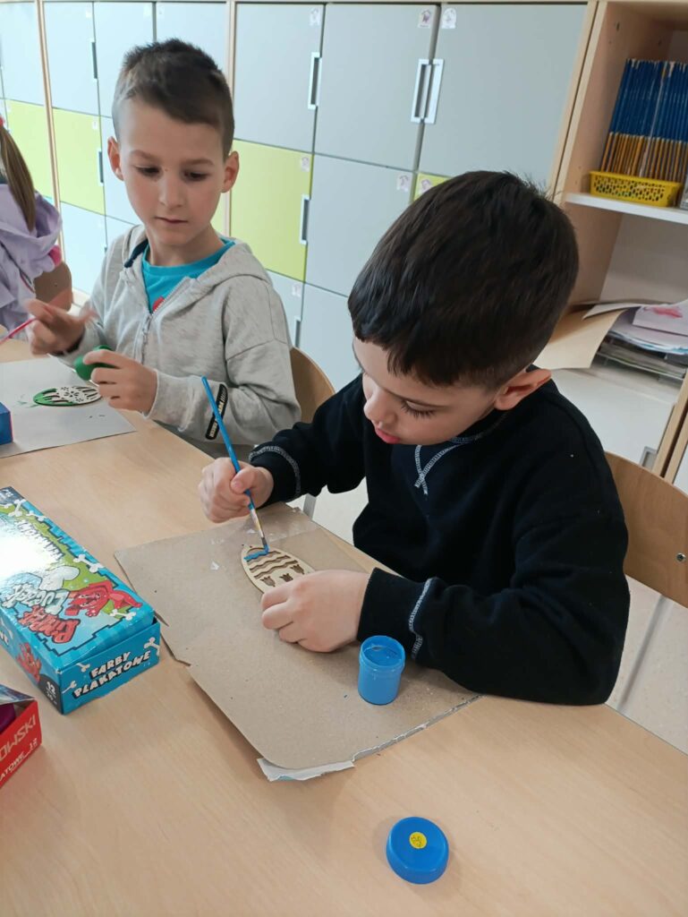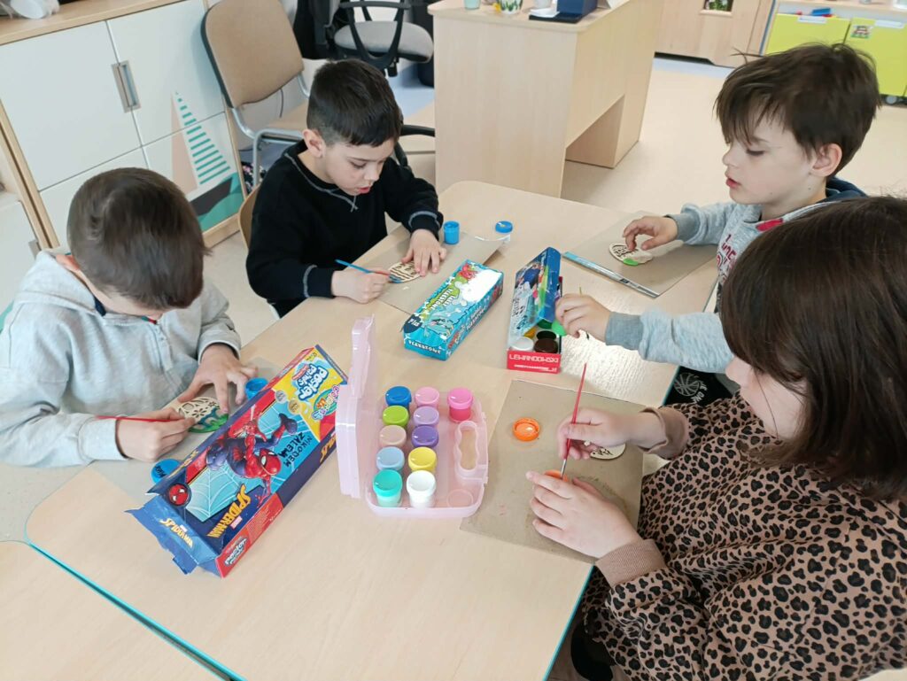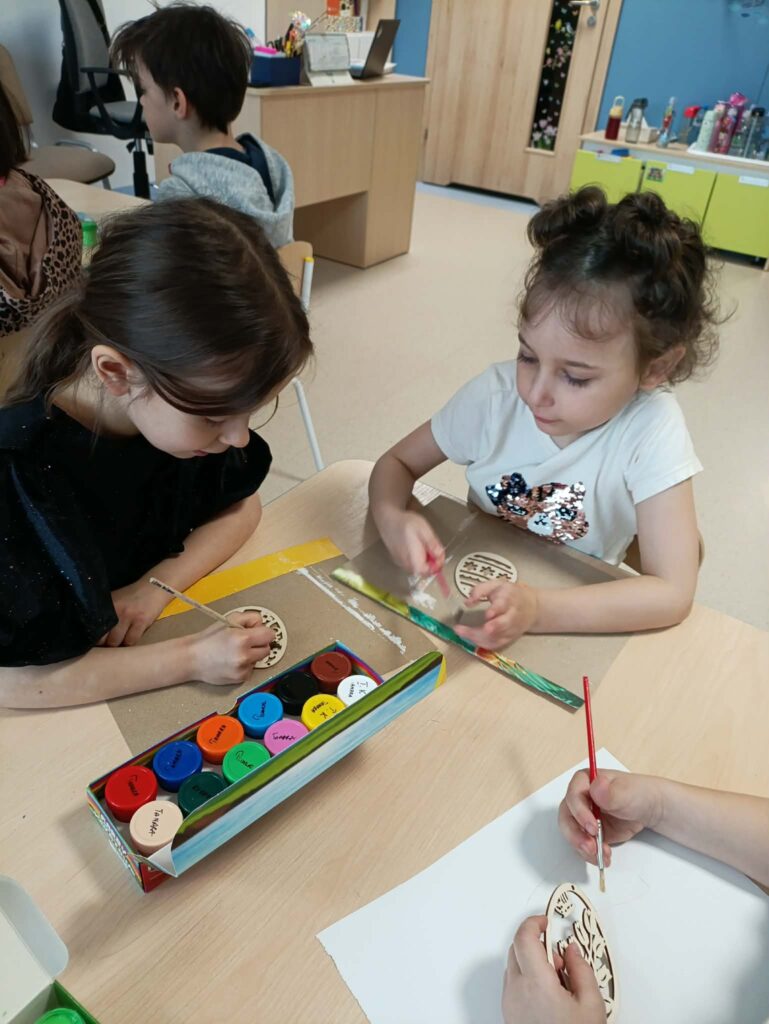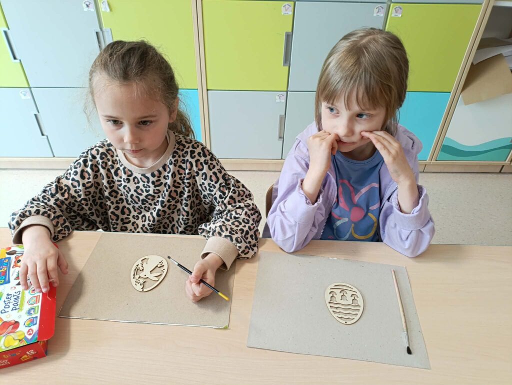 Dzieci z grupy „Motylki” wzięły udział w wielkanocnych warsztatach plastycznych, które dostarczyły im wiele radości i okazji do twórczej aktywności. Podczas zajęć przedszkolaki ozdabiały i malowały drewniane pisanki, wykazując się dużą pomysłowością i starannością.