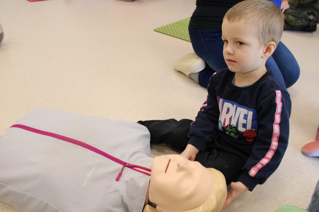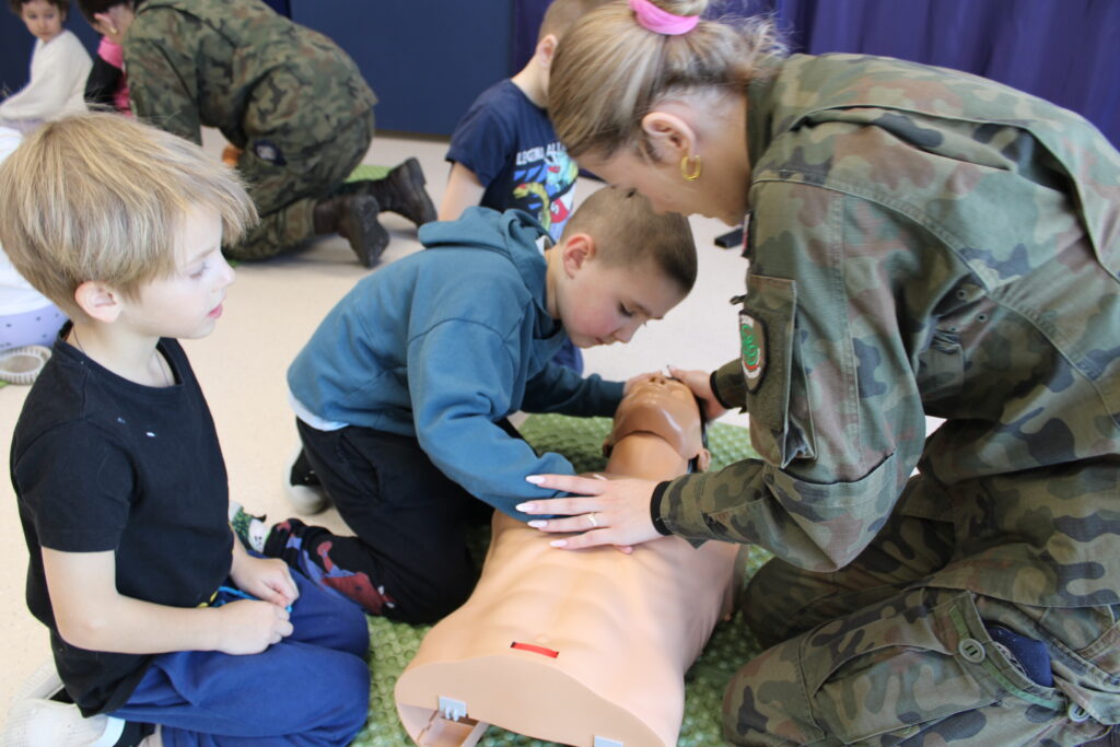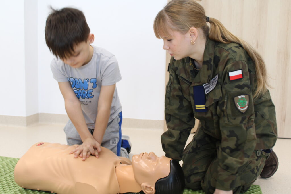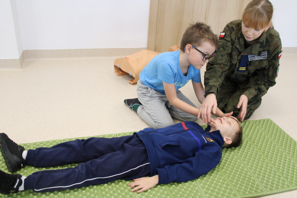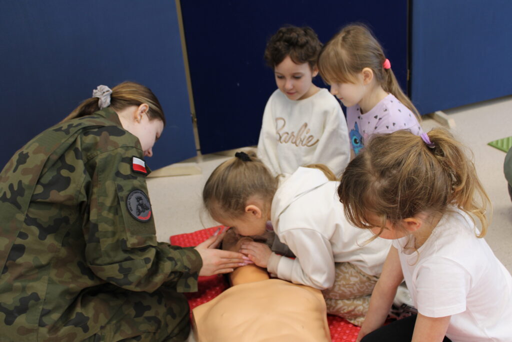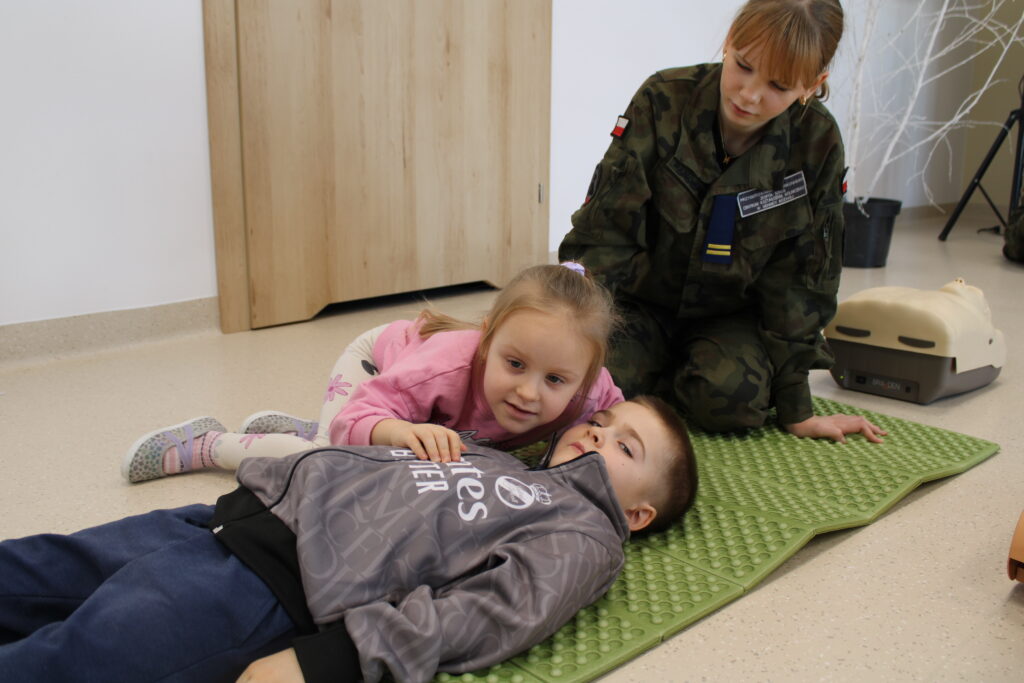 Spotkanie miało charakter praktyczny i cieszyło się ogromnym zainteresowaniem wśród dzieci. Uczestnicy z dużym zaangażowaniem brali udział w ćwiczeniach, podczas których uczyli się m.in. układania poszkodowanego w pozycji bocznej bezpiecznej oraz resuscytacji krążeniowo-oddechowej.