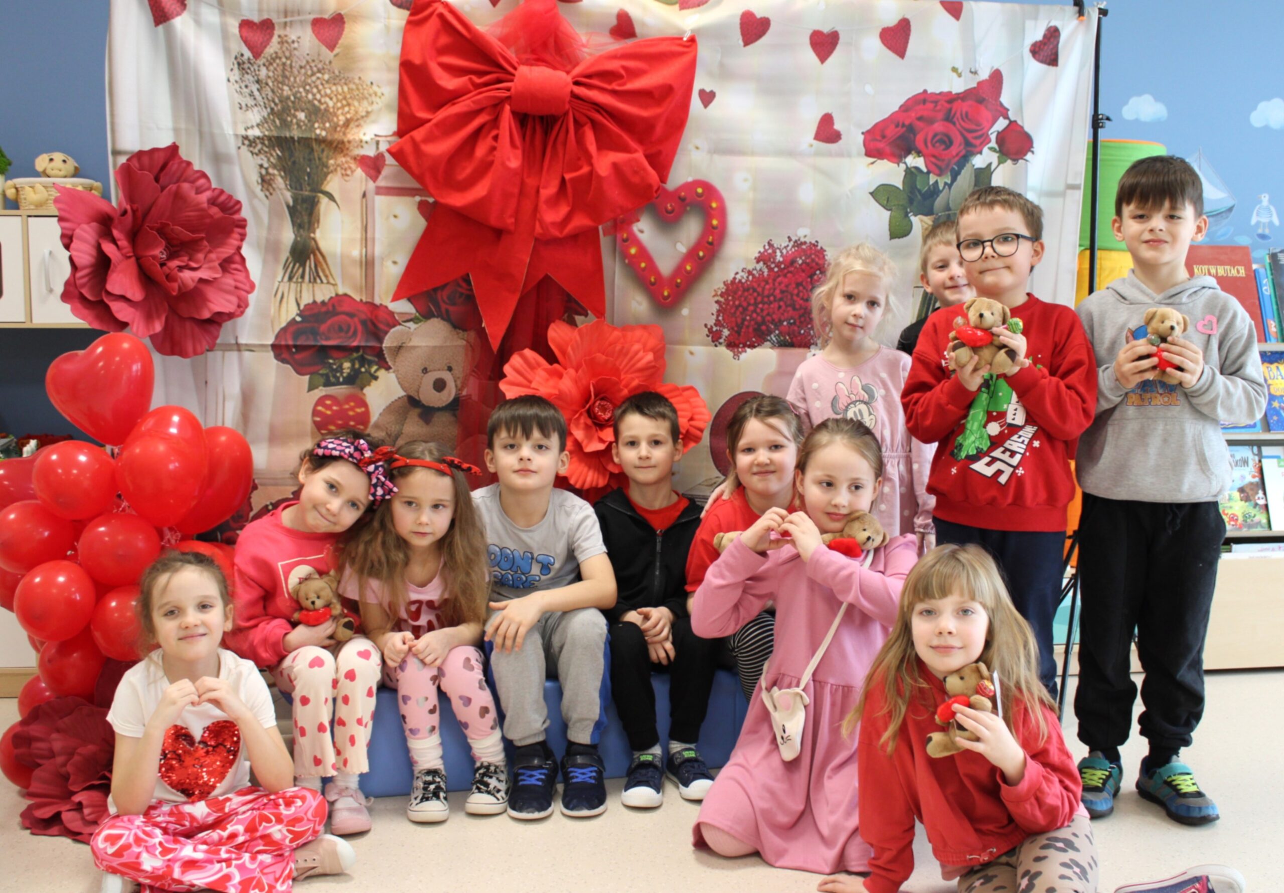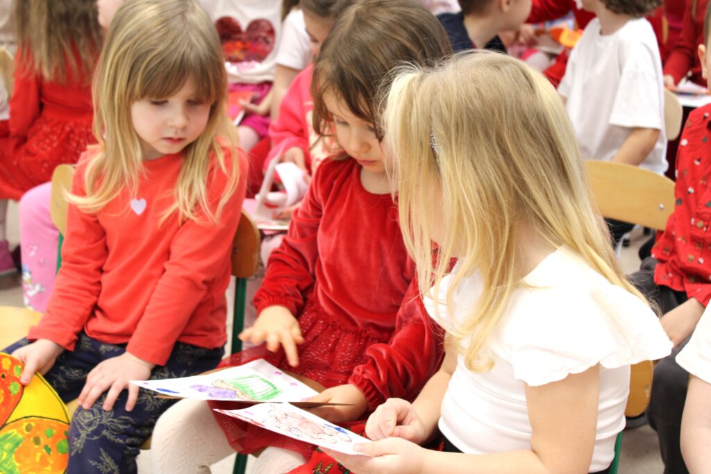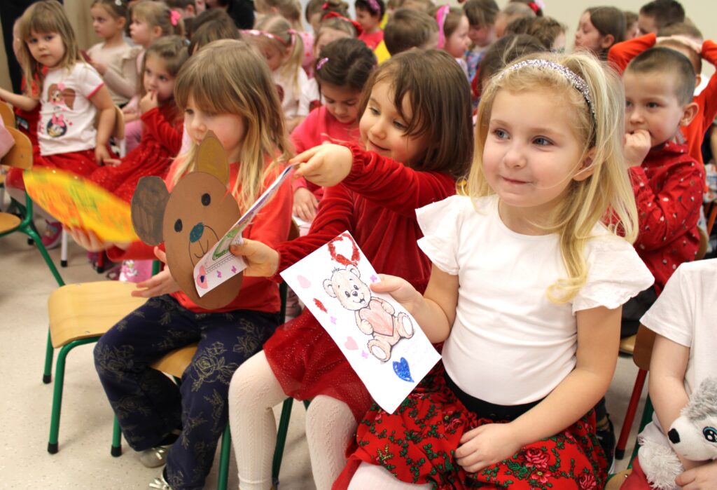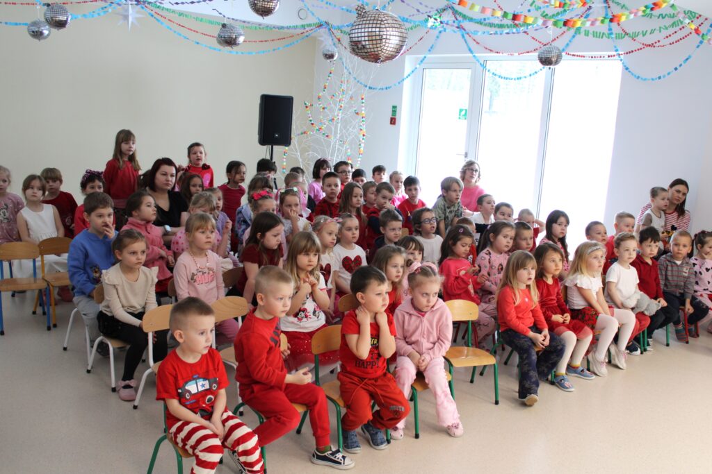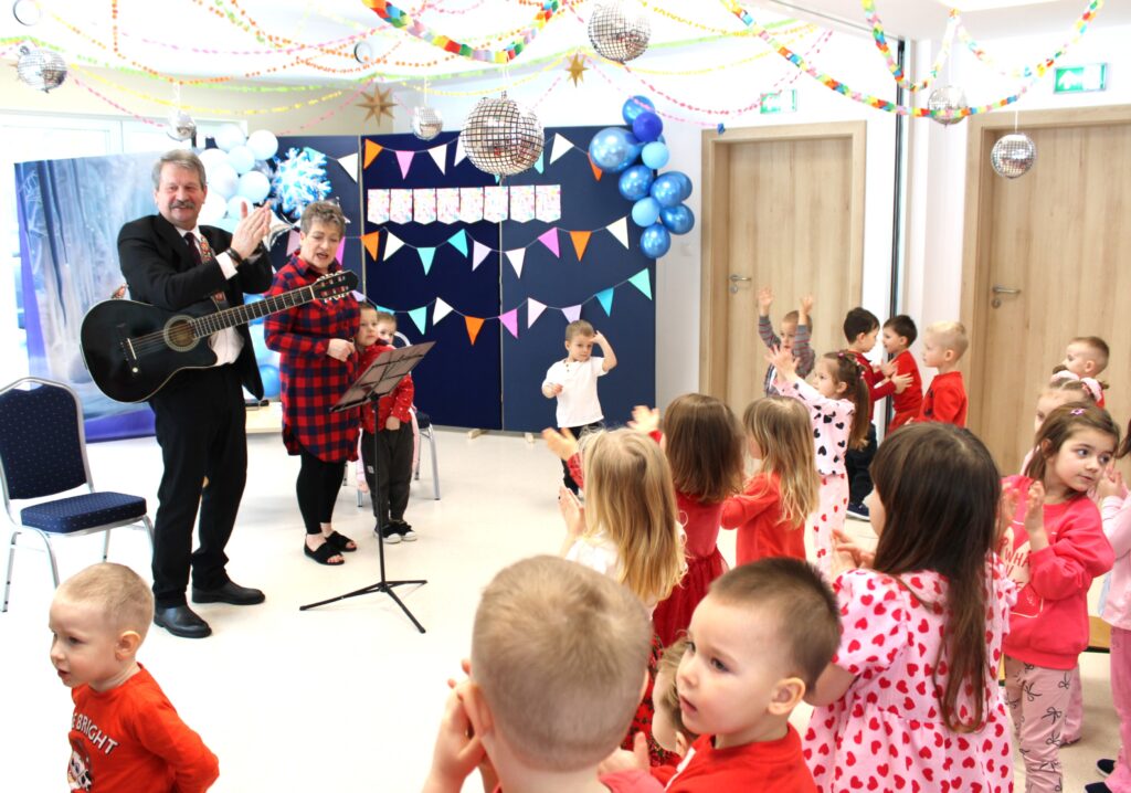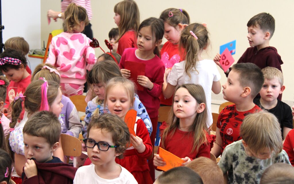 Pod takim hasłem bawiliśmy się dnia 13 lutego 2026 r. w naszym przedszkolu z okazji Walentynek. Była to wspaniała okazja do rozwijania u dzieci poczucia przynależności do społeczności przedszkolnej, nawiązywania kontaktów interpersonalnych oraz zachęcania podopiecznych do okazywania sympatii, życzliwości, akceptacji i tolerancji innym osobom. Dzieci wzięły udział w spotkaniu z panem Januszem Ślipeckim dawnym dyrektorem Szkoły Podstawowej w Siennicy Różanej. Pan Janusz z wielkim zaangażowaniem mówił o swojej pasji, którą jest miłość do muzyki, do gry na gitarze. Dzieci nauczyły się piosenki „Co powie tata” Natalii Kukulskiej. Podczas świętowania walentynek panował wyjątkowy nastrój. W przedszkolu królował kolor czerwony. Niewątpliwie miłym akcentem była ” Poczta Walentynkowa”, która została doręczona adresatom na zakończenie spotkania. W czasie spotkania rozmawialiśmy o zagrożeniach jakie mogą nas spotkać w czasie odpoczynku w ferie zimowe.