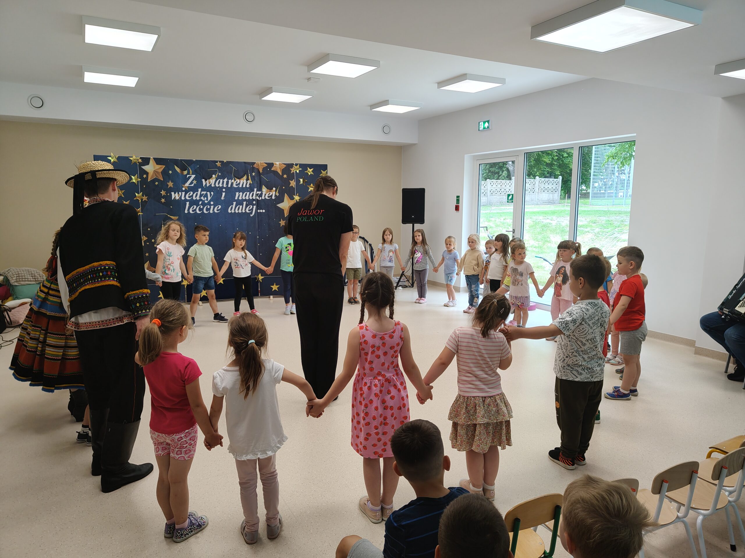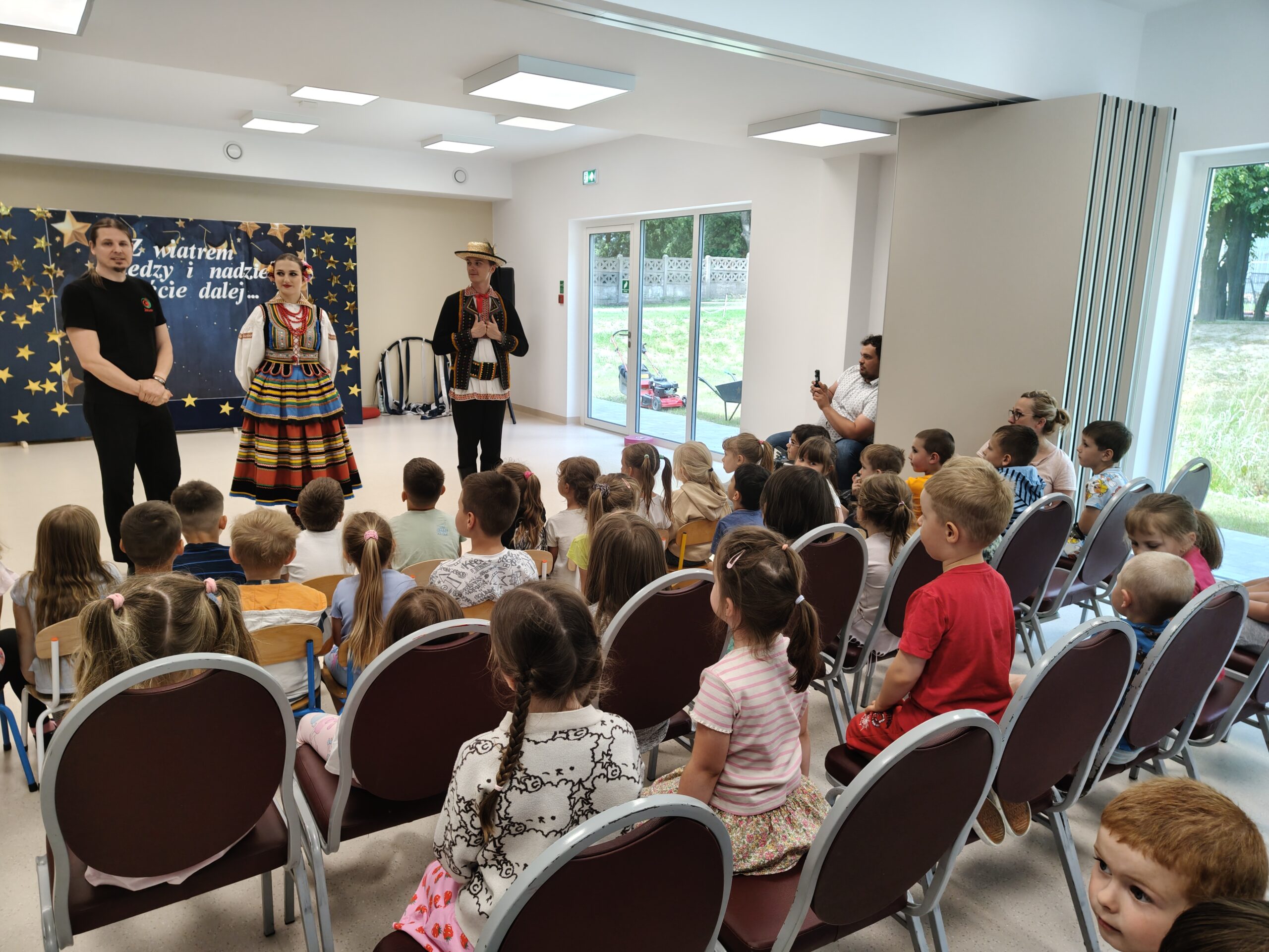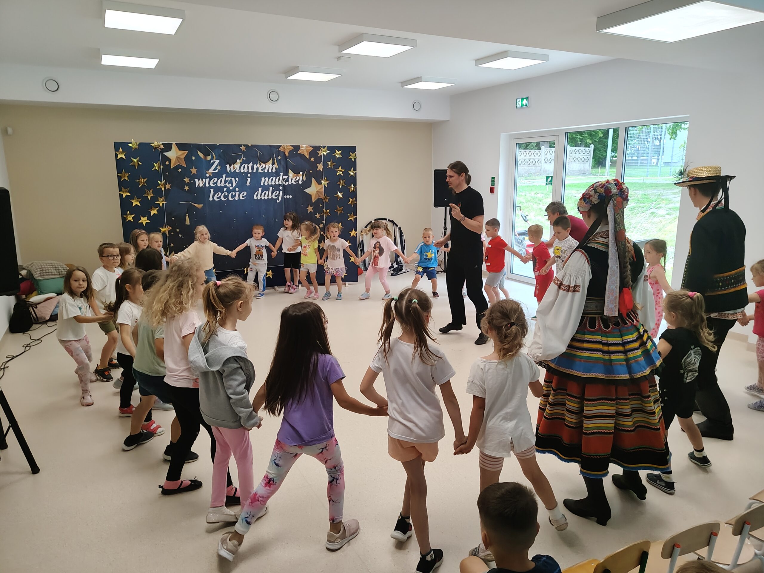 W dniu 24 czerwca 2025 roku dzieci z naszego przedszkola miały okazję uczestniczyć w warsztatach tanecznych. Warsztaty organizowało Centrum Kultury w Siennicy Różanej w ramach projektu Festiwalu Tradycji „Siennickie Sobótki” finansowane MEN ze środków programu Nasze Tradycje. Zajęcia taneczne przeprowadził instruktor zespołu tanecznego Jawor z Lublina. Dzieci dowiedziały się jak wygląda strój ludowy krzczonowski, nazwy podstawowych tańców ludowych jak Krakowiak oraz ich elementów jak: krzesany, kaszka, cwał. Dzieciom bardzo podobały się podstawowe kroki Krakowiaka oraz piękne stroje pary tanecznej z zespołu Jawor. Dziękujemy pani Dyrektor CK w Siennicy Różanej Agnieszce Poźniak za zorganizowanie warsztatów i dostarczenie naszym wychowankom tak wiele radości.