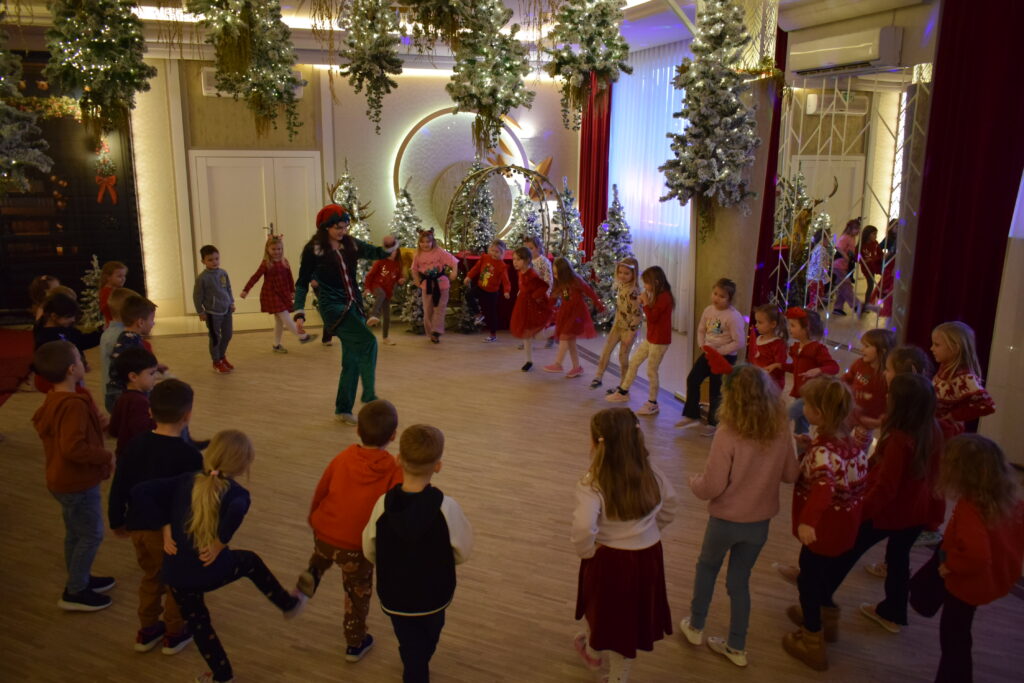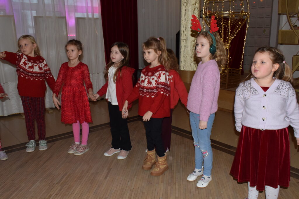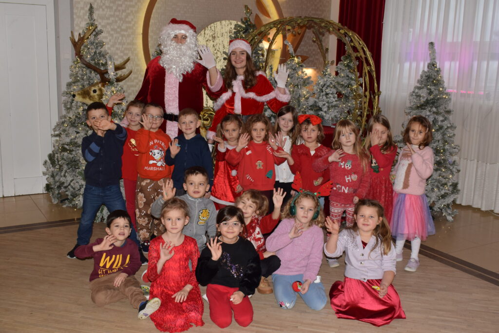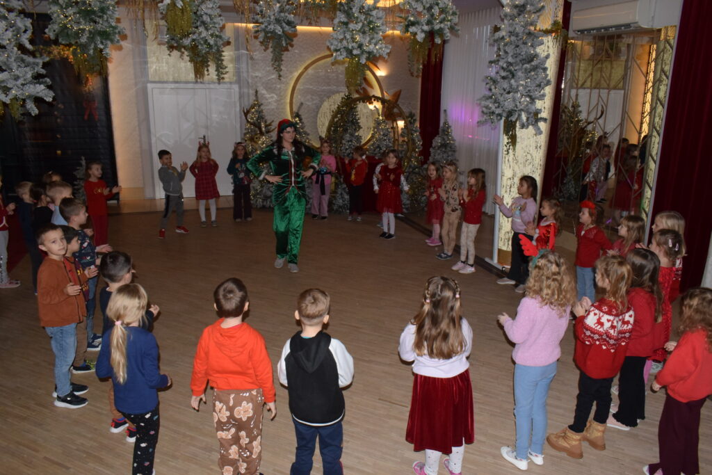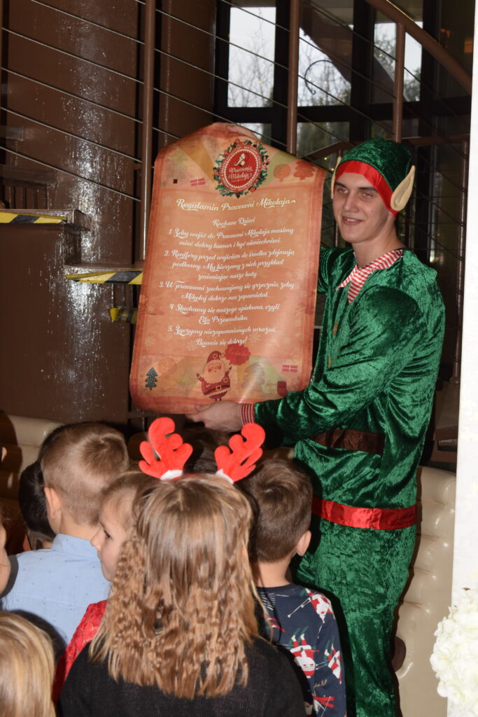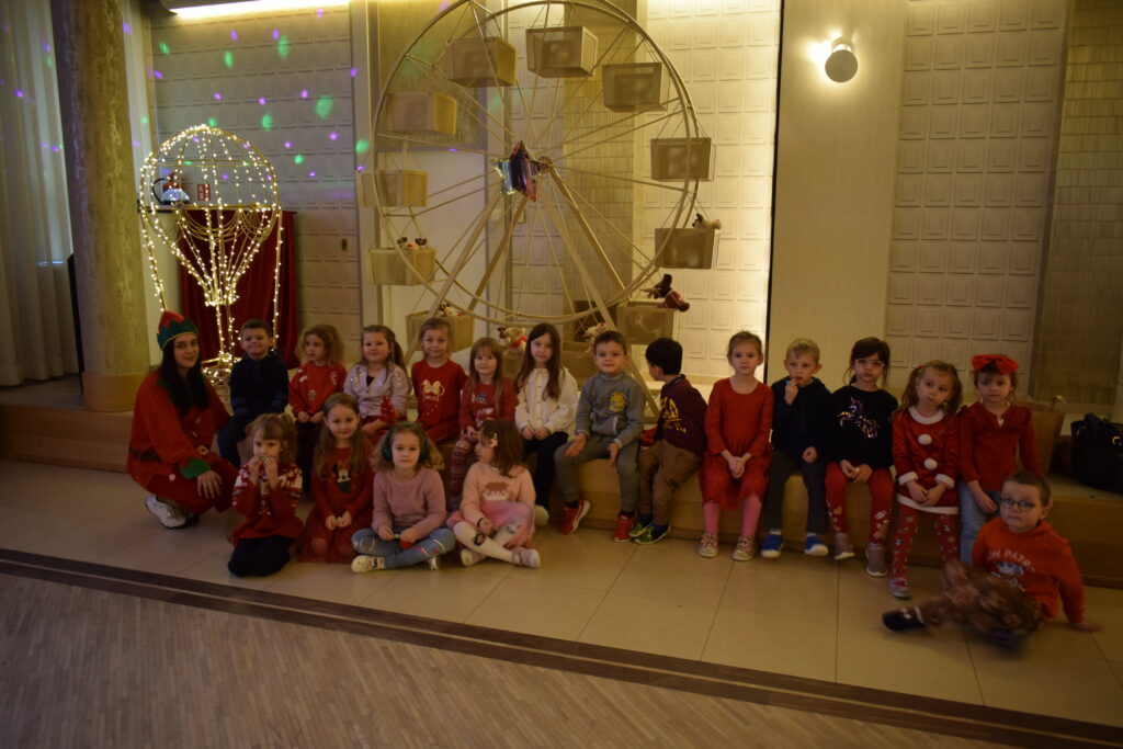 W trakcie pobytu w fabryce dzieci miały także okazję wziąć udział w zabawach i tańcach z elfami oraz panią Mikołajową. Radość, śmiech i taneczne figury rozbrzmiewały w całej sali, a przedszkolaki mogły poczuć się jak bohaterowie świątecznej bajki.