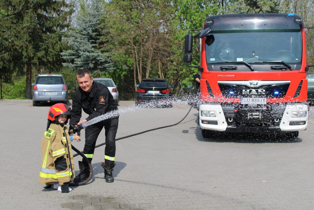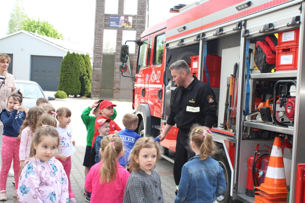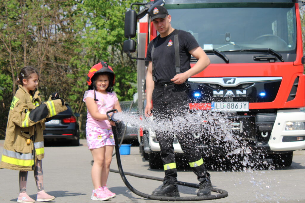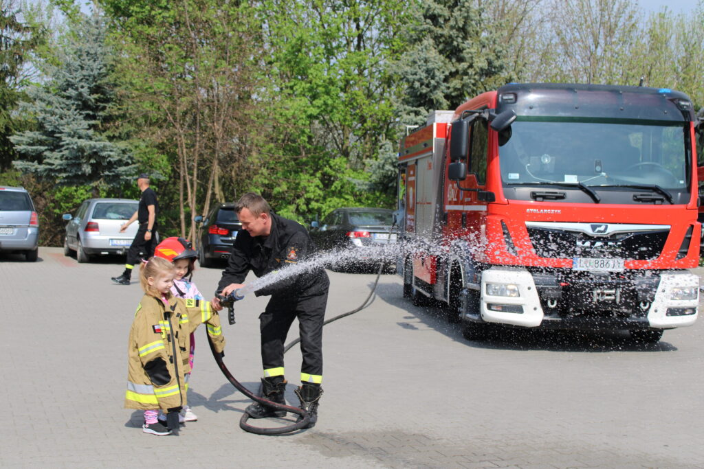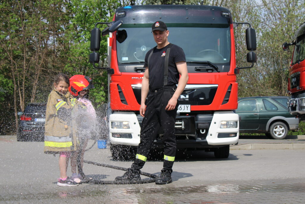 Na początku wizyty dzieci obejrzały krótkie filmy edukacyjne, które w przystępny sposób przybliżyły im, jak zachować się w sytuacji zagrożenia pożarem oraz jak wygląda praca strażaków. Następnie przedszkolaki miały okazję zobaczyć z bliska wyposażenie wozu strażackiego i sprzęt używany podczas akcji ratowniczych. Dużym zainteresowaniem cieszyła się również możliwość samodzielnego użycia strażackiej sikawki – dzieci z entuzjazmem próbowały celować strumieniem wody do wyznaczonych celów.