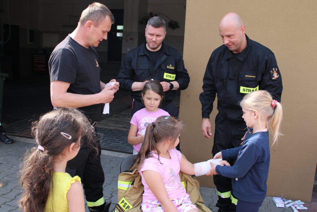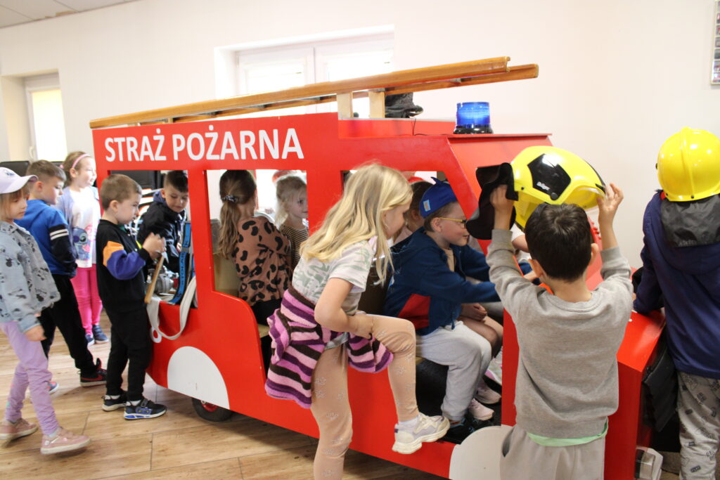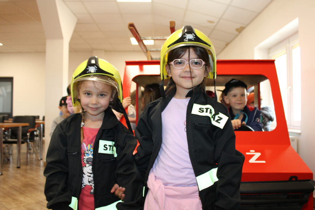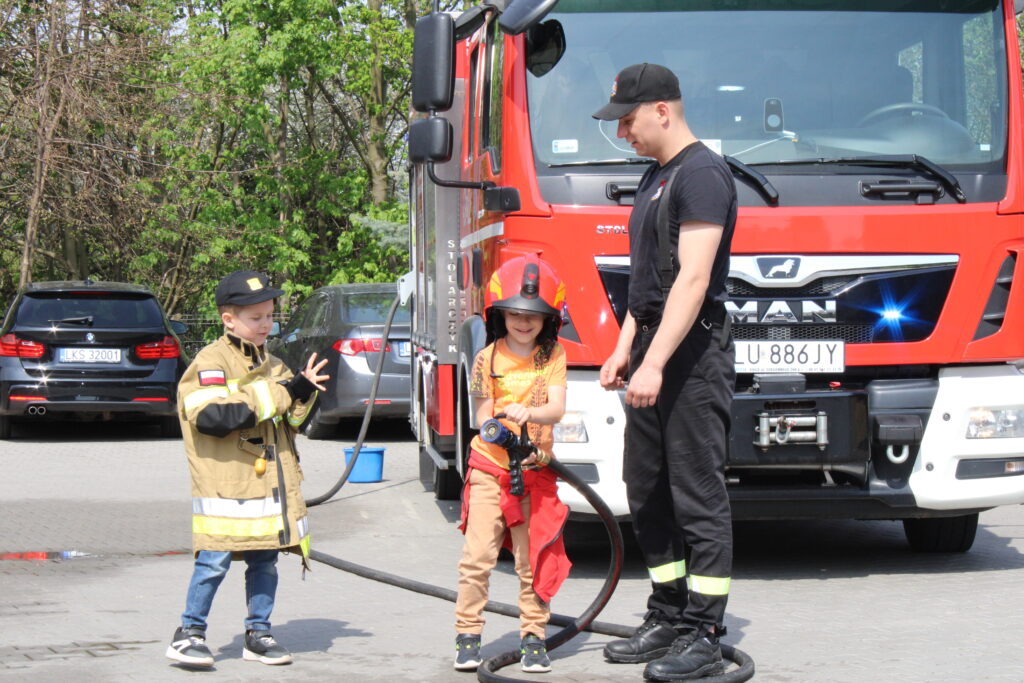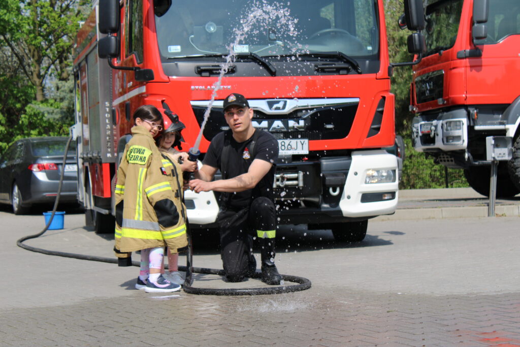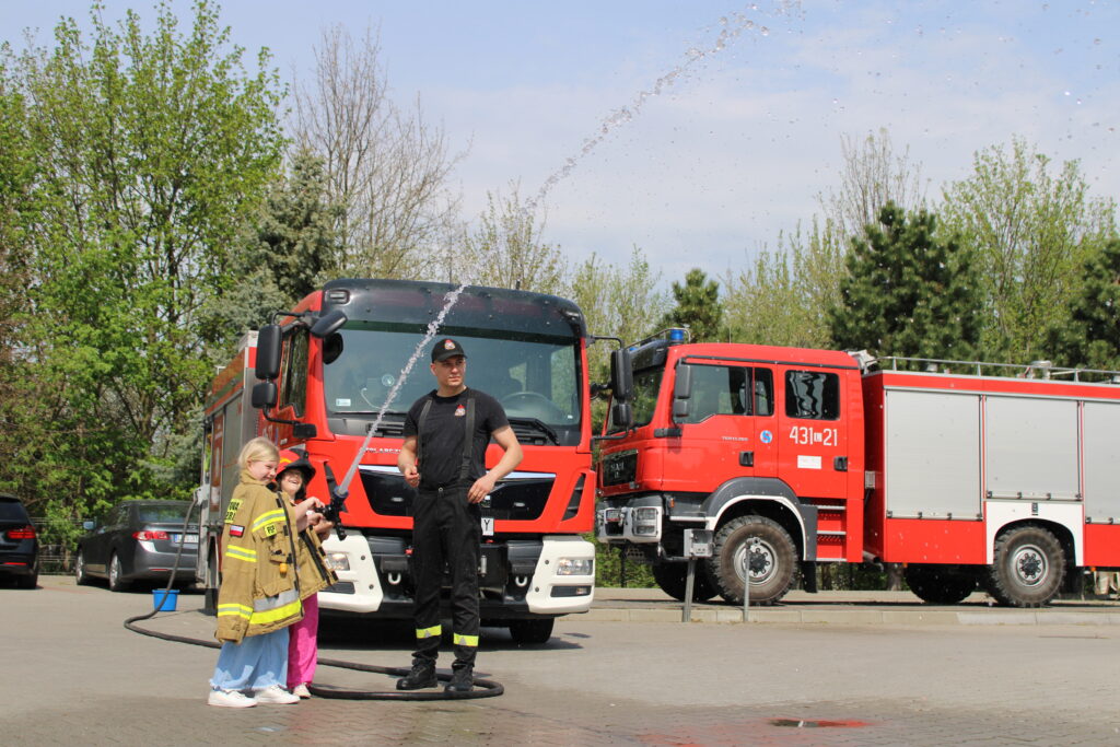 Na początku wizyty dzieci obejrzały krótkie filmy edukacyjne, które w przystępny sposób przybliżyły im, jak zachować się w sytuacji zagrożenia pożarem oraz jak wygląda praca strażaków. Następnie przedszkolaki miały okazję zobaczyć z bliska wyposażenie wozu strażackiego i sprzęt używany podczas akcji ratowniczych. Dużym zainteresowaniem cieszyła się również możliwość samodzielnego użycia strażackiej sikawki – dzieci z entuzjazmem próbowały celować strumieniem wody do wyznaczonych celów.
