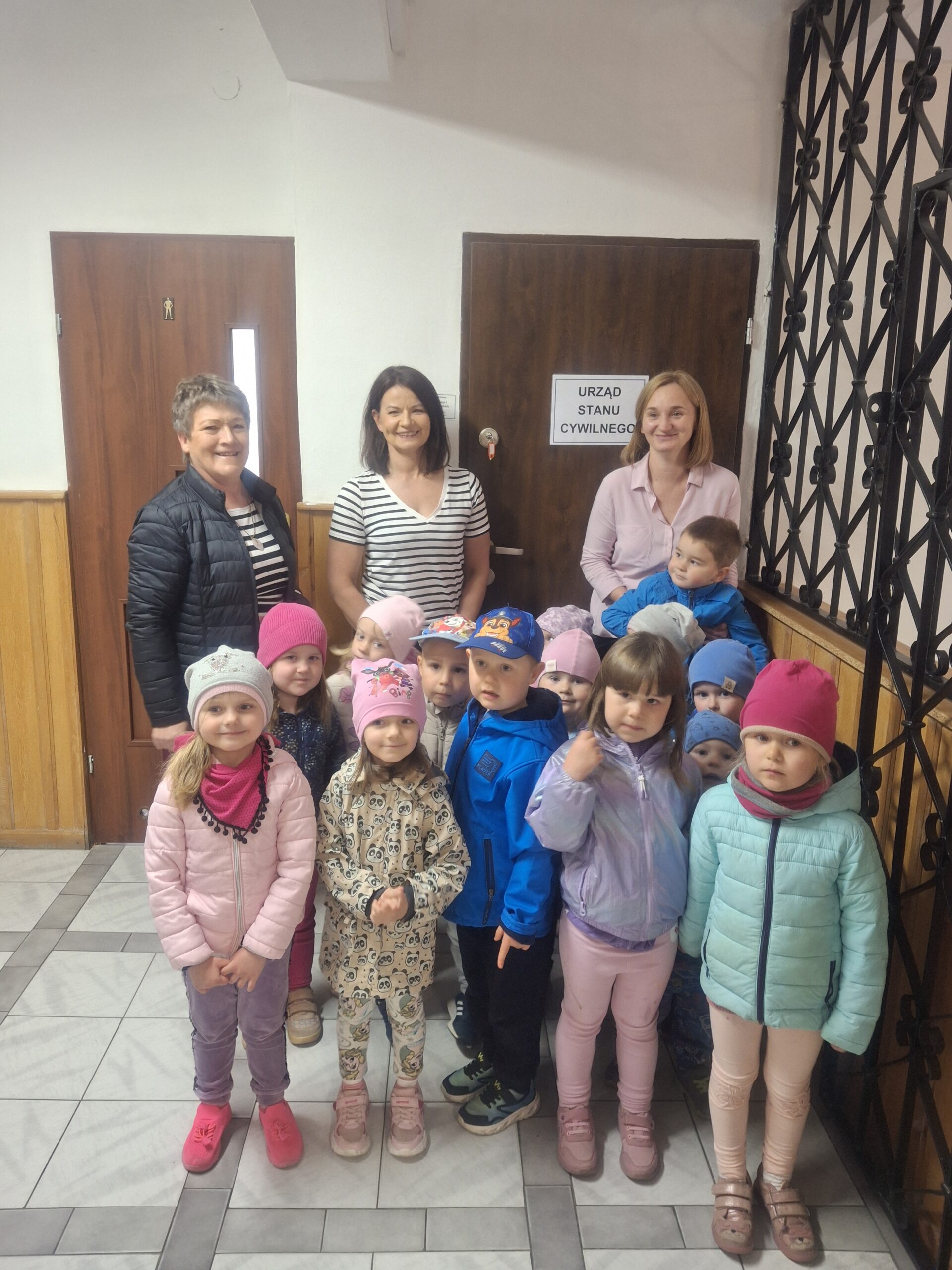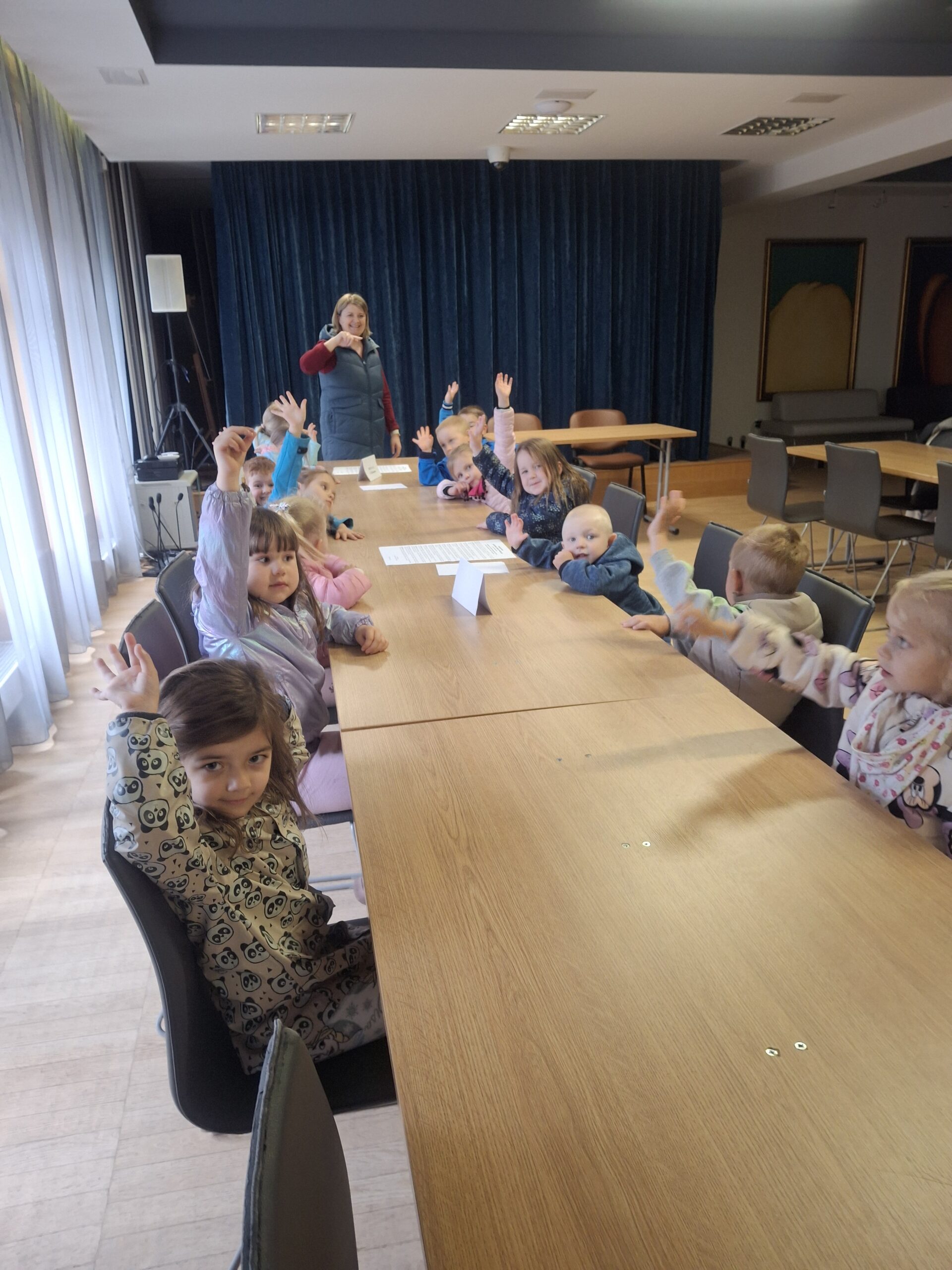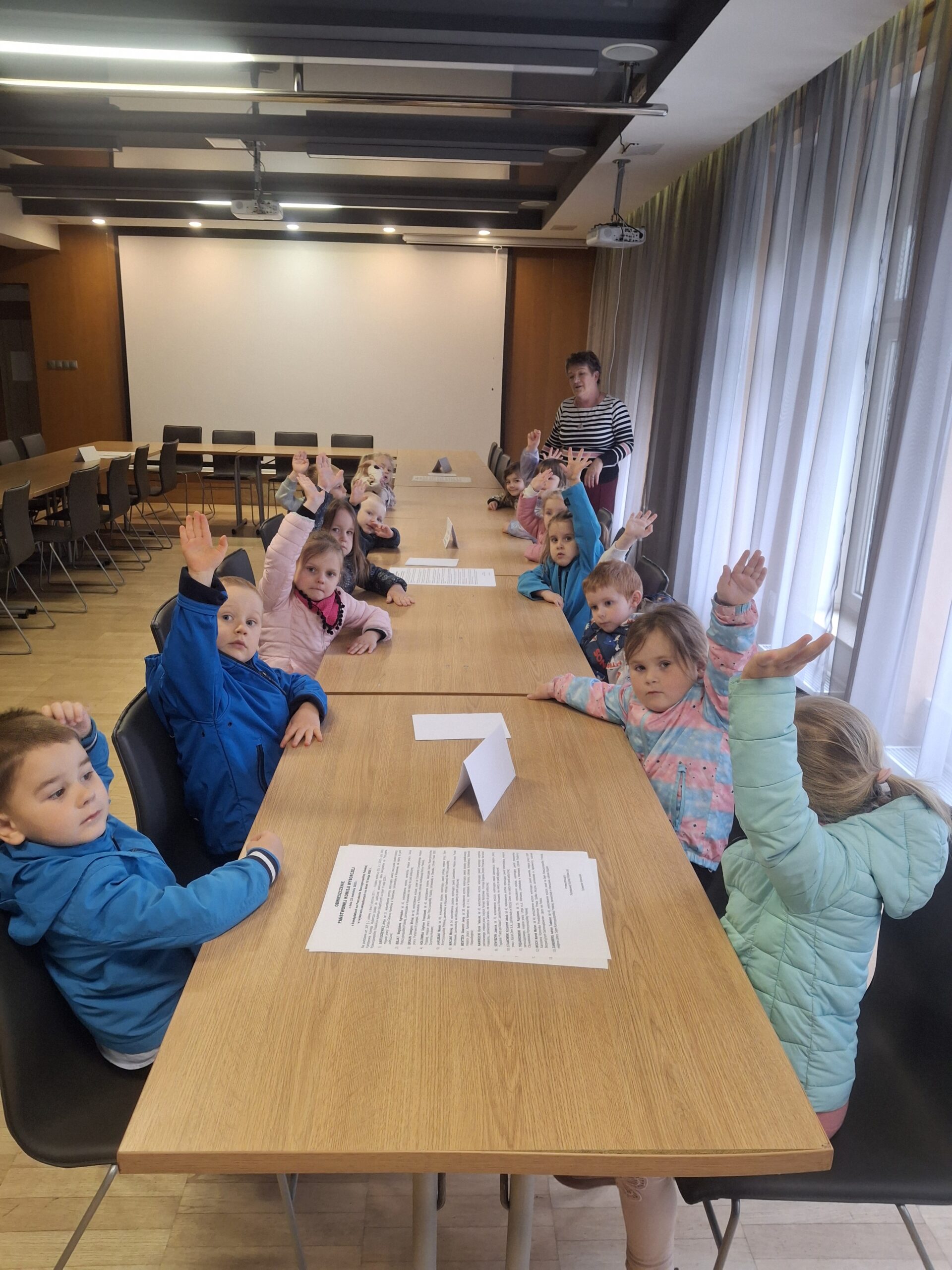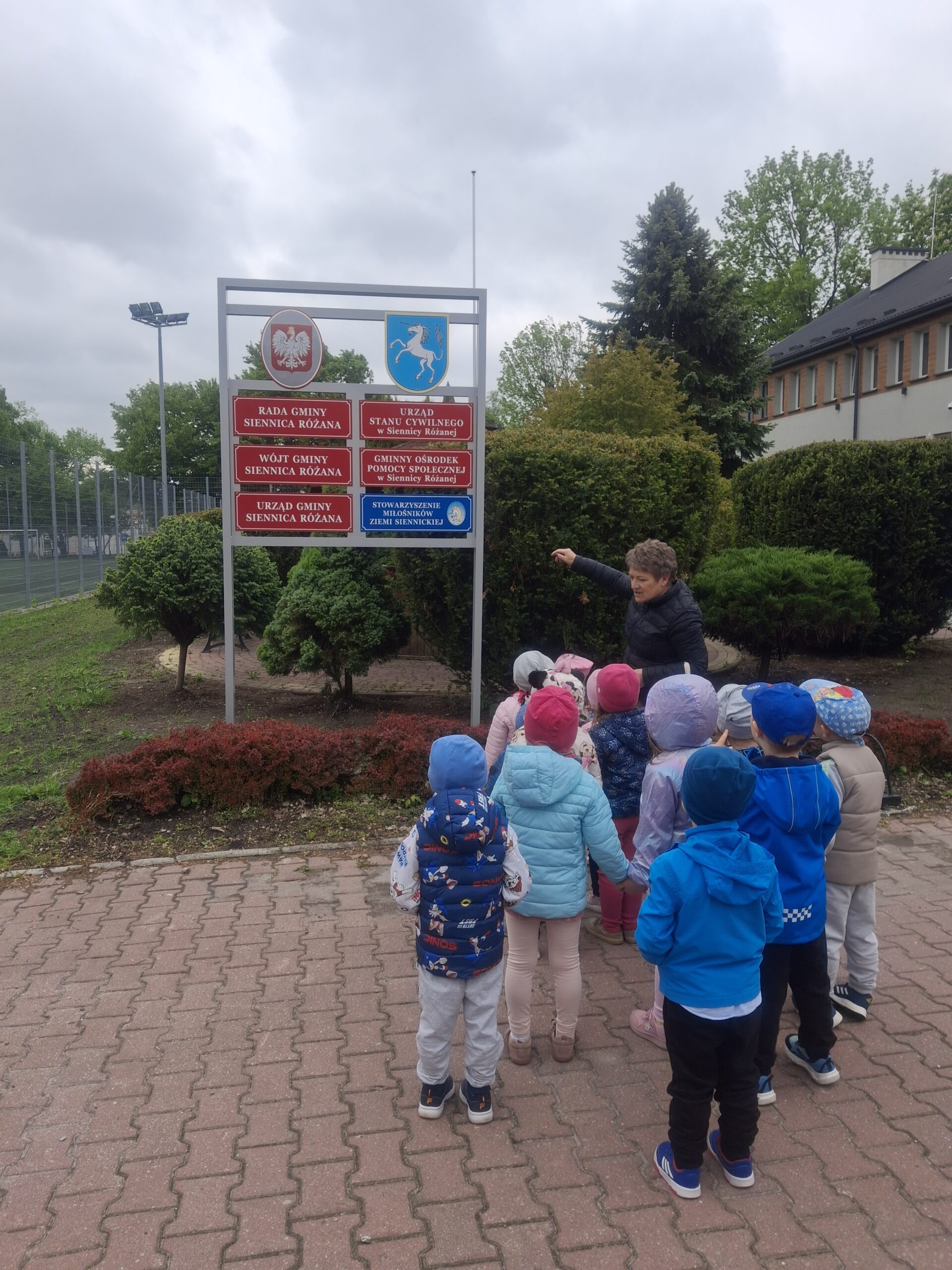 W ramach realizacji zadań z Podstawy Programowej wychowania Przedszkolnego związanych z poznawaniem instytucji i obiektów naszej miejscowości dnia 16 maja 2025 r. najmłodsza grupa wybrała się do Urzędu Gminy w Siennicy Różanej. Tam odbyło się krótkie spotkanie z wójtem naszej gminy Panem Leszkiem Proskurą, który pomimo wielu obowiązków przerwał ważne spotkanie aby przywitać się i zamienić kilka zdań z naszymi przedszkolakami. Rozmawialiśmy również z paniami z Urzędu Stanu Cywilnego. W budynku gminy zwiedziliśmy salę konferencyjną, gdzie odbywają się rożne ważne spotkania i uroczystości jak i sesje Rady Gminy. Dzieci przez chwilę mogły poczuć się jak w sejmiku przedszkolnym.